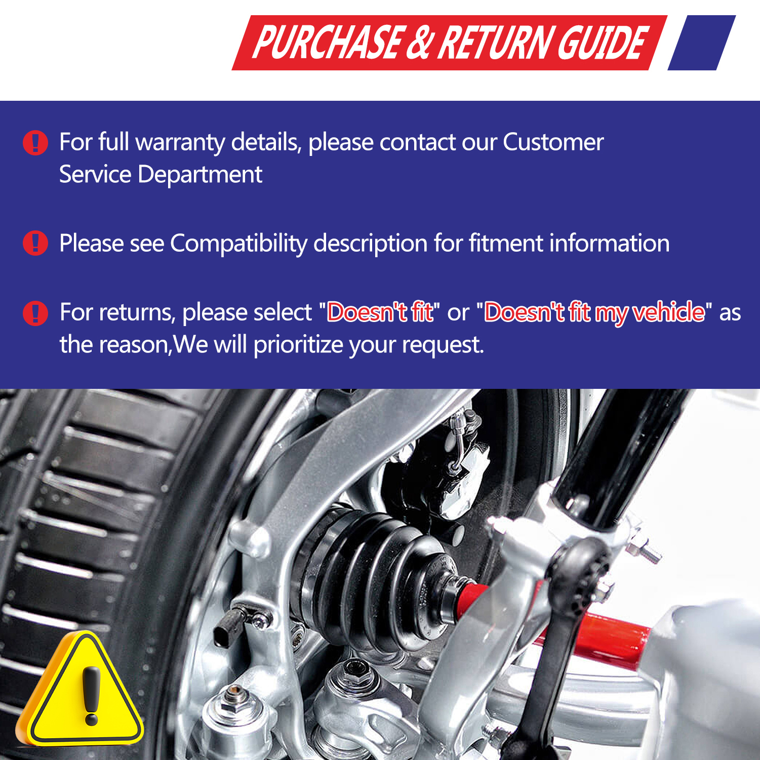 6-For returns, please select "Doesn't fit" or "Doesn't fit my vehicle", we will prioritize your request. Thanks!