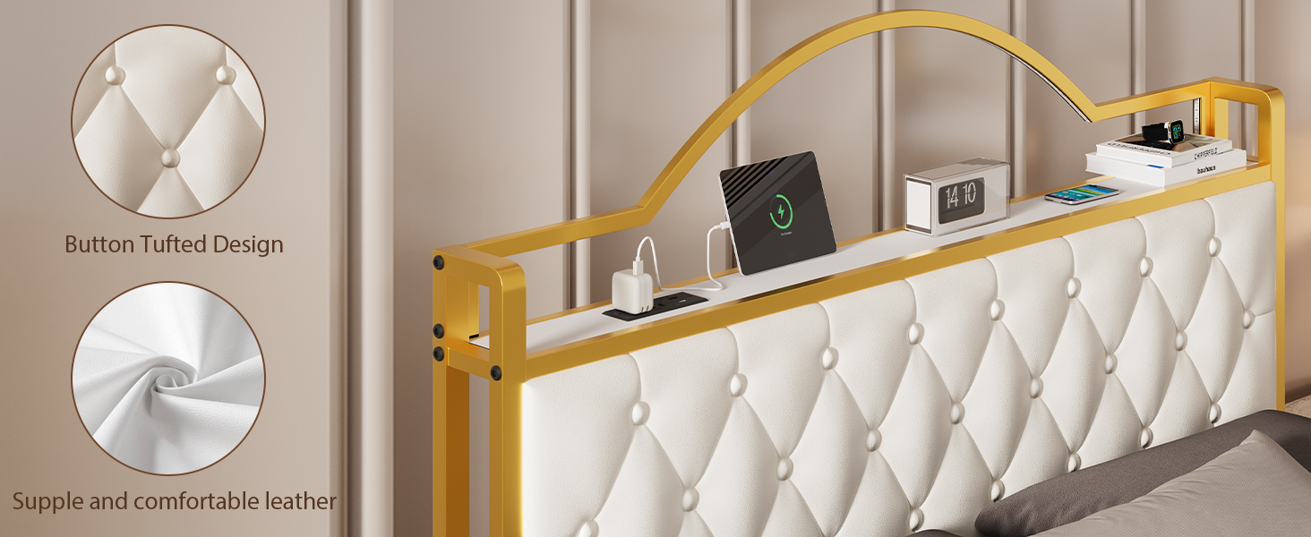 2. Enjoy ultimate convenience with the integrated charging station on the headboard. Equipped with a Type-C port, USB port, and an AC outlet, it powers all your devices clutter-free. The spacious surface holds essentials, merging sleek design with practicality for your modern bed frame.
