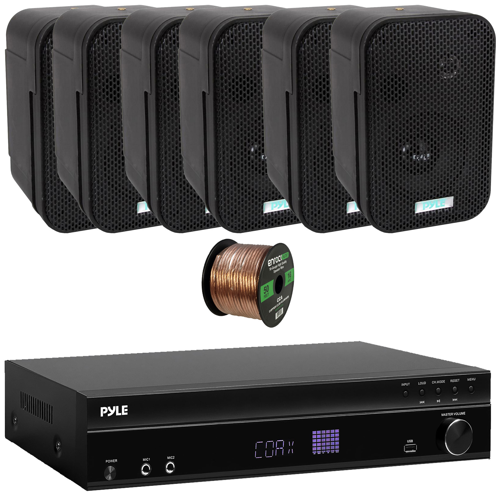 Pyle PT875BT 5.2 Channel 1000W Max USB-A MP3 Player FM Radio Bluetooth Home Theater Amplifier Receiver, 6x Pyle PDWR30B 3.5" 300 Watts Max Power Indoor/Outdoor Black Waterproof Speakers, Speaker Wire