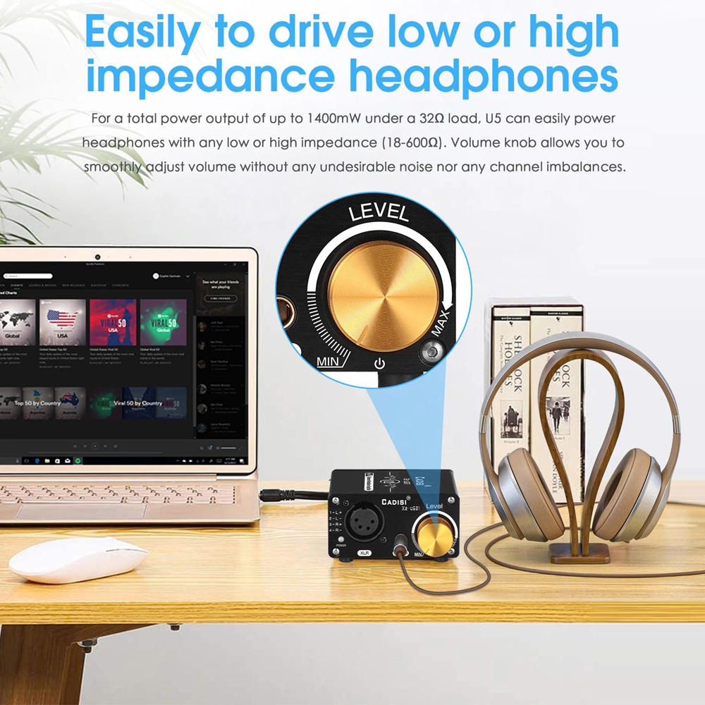 - Easily to drive low or high impedance headphones: For a total power output of up to 1400mW under a 32Ω load, U601 can easily power headphones with any low or high impedance (18-600Ω). Volume knob allows you to smoothly adjust volume without any undesirable noise nor any channel imbalances.