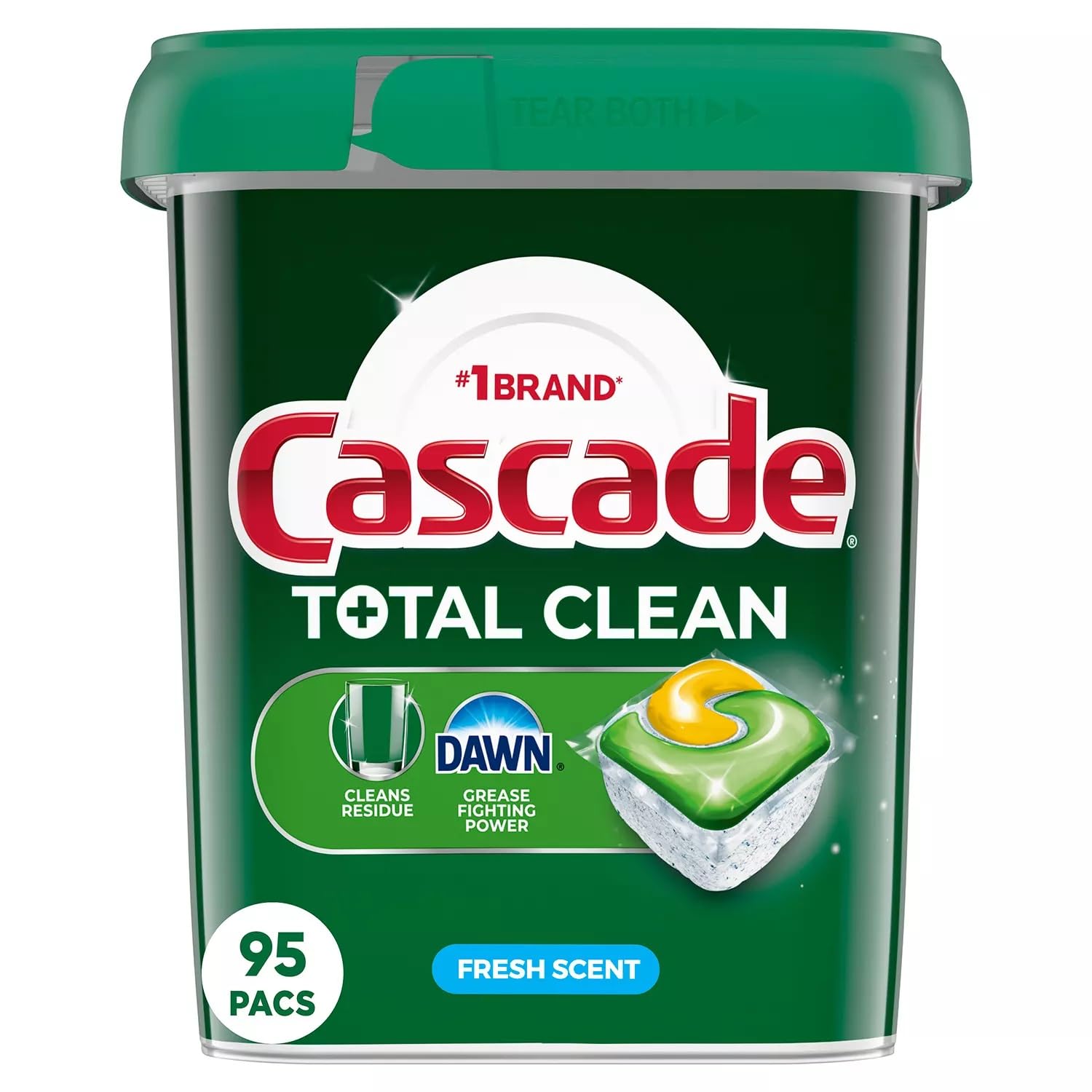 Cascade Total Clean ActionPacs dishwasher detergent is designed to tackle your toughest dried-on messes. Formulated to power away greasy residue, these dishwasher pods leave your dishes sparkling clean in one easy-to-use pod, with no residue left behind. The ActionPacs combine the scrubbing power of Cascade and the grease-fighting power of Dawn, resulting in virtually spotless dishes. These ActionPacs dissolve quickly in your dishwasher to unleash their cleaning power early in the cycle. They leave virtually no mess, only clean dishes and a light fresh scent. To use, simply load your dishwasher, pop in a Total Clean ActionPac, and go. Cascade is proud to be the #1 Most Recommended Brand in North America, with more dishwasher brands recommending Cascade over any other automatic dishwashing detergent brand. By using your dishwasher and Cascade ActionPacs every day, you can save up to 100 gallons of water per week compared to washing dishes at a running sink for 10 minutes per day. Energy Star certified dishwashers use less than four gallons of water in each cycle, whereas a running sink can use four gallons of water every two minutes. Even with as few as eight dishes, you can save water compared to washing those dishes by hand at a running sink for two minutes.