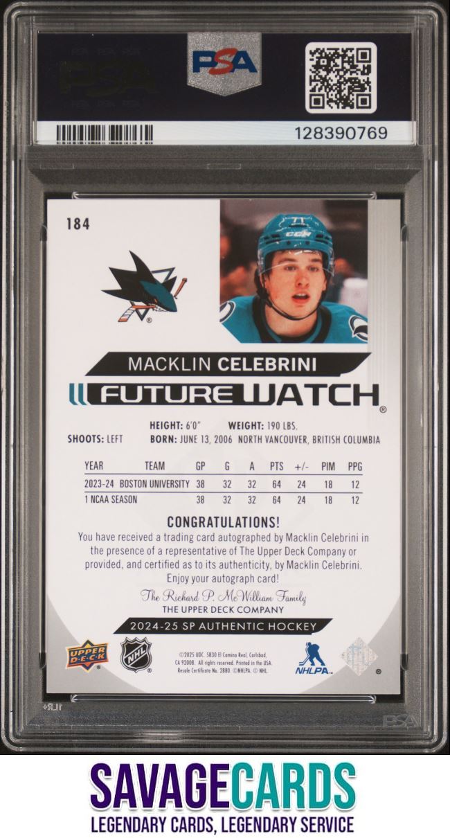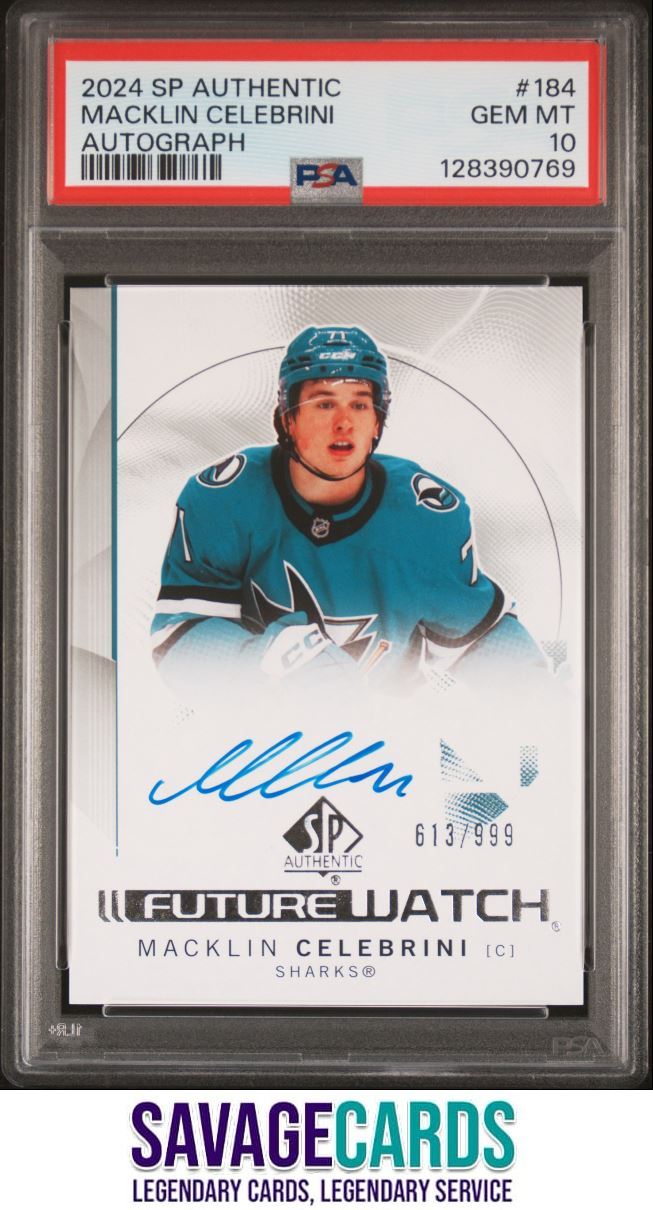 | 2024-25 SP Authentic Future Watch Auto Macklin Celebrini PSA 10 /999 #184 San | ||||||||||||||||||||