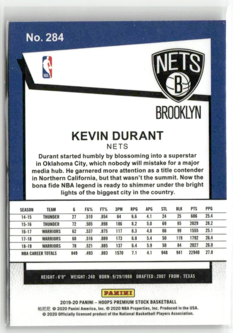 | Kevin Durant 2019-20 Hoops Premium Stock Tribute Brooklyn Nets #284 | ||||||||||||||||||