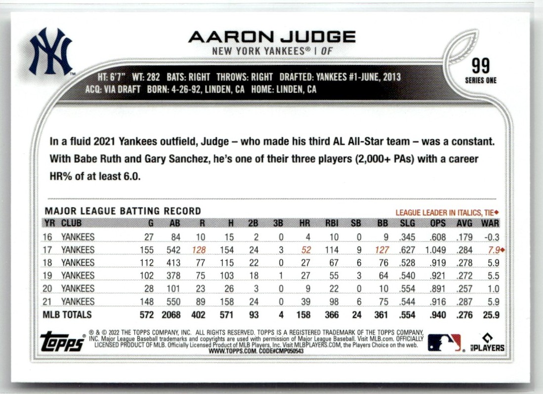 | Aaron Judge 2022 Topps New York Yankees #99 | ||||||||||||||||