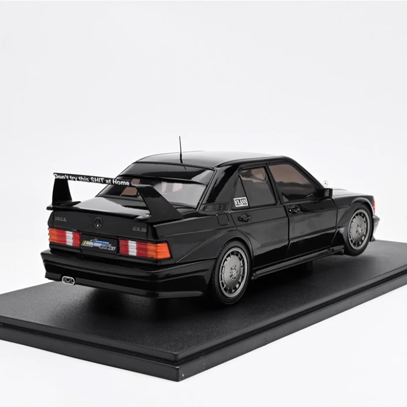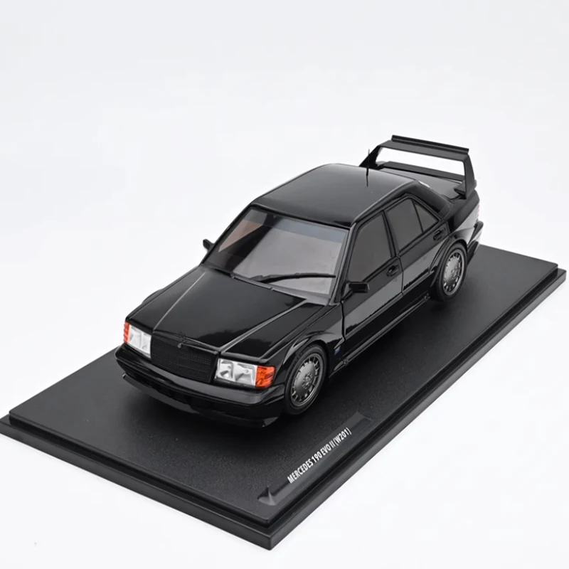 Experience the realism of this meticulously crafted diecast model, representing the iconic Mercedes-Benz 190E W201 EVO II in a sleek black finish. With a 1:18 scale, it offers an impressive level of detail that captures the original car's sporty elegance and refined contours. The alloy construction displays a polished surface, accurately molded lines, and realistic features like the grille, headlights, and rear wing spoiler. The transparent windows reveal a detailed interior, while multi-spoke alloy rims with textured black tires add a dynamic and sporty touch. This model is designed for display, collection, or decoration, offering a sophisticated aesthetic that any car enthusiast will appreciate. Its compact size makes it a perfect addition to your collection.