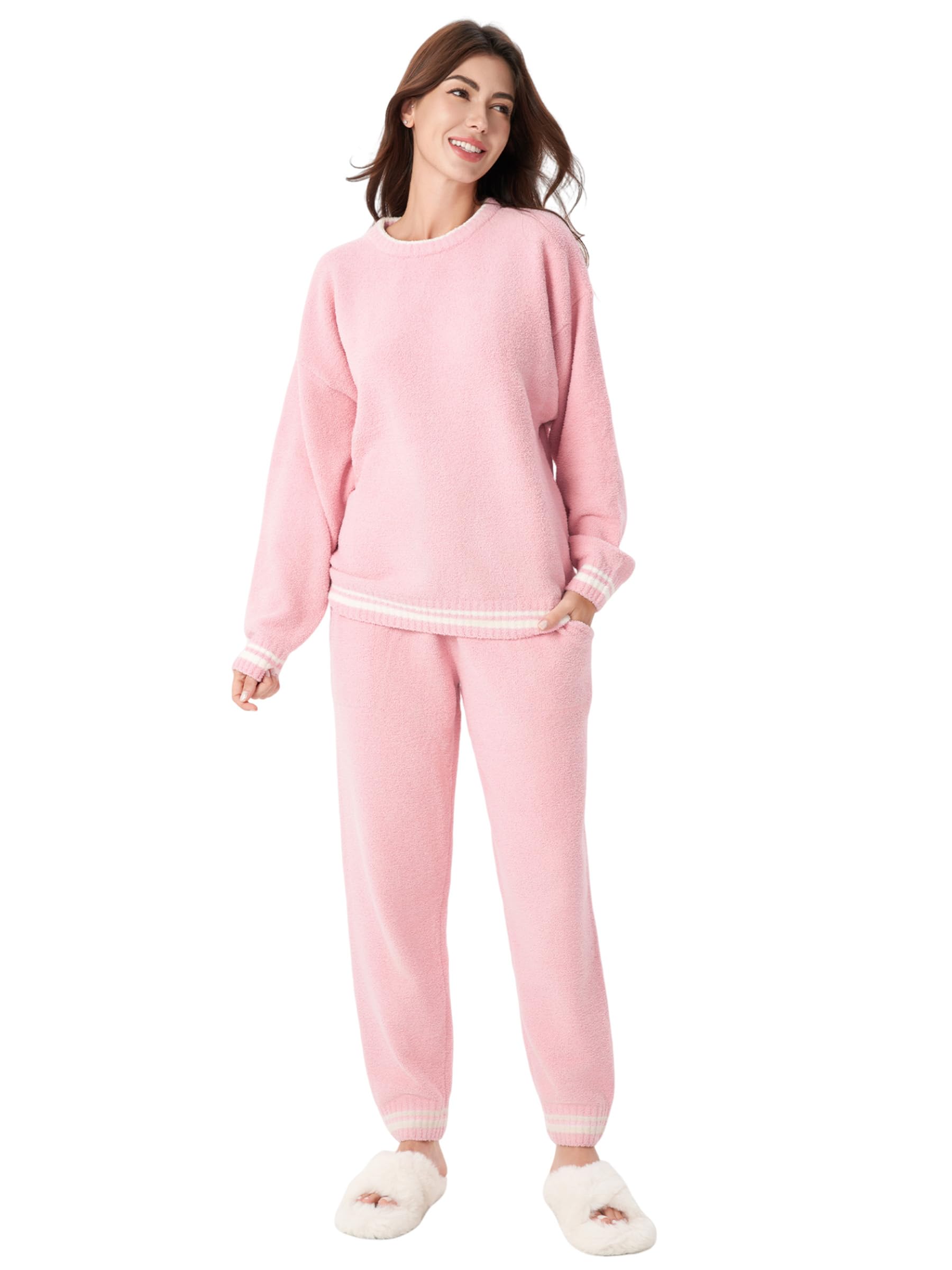 【Matching Set】The two-piece fleece pajama set includes a crew neck pullover top and a pair of cozy plush pants. The soft waistband won't leave marks on the skin. The elastic cuffs at the ankles enhance warmth, and the spacious pockets can hold your phone and wallet, making daily life convenient!