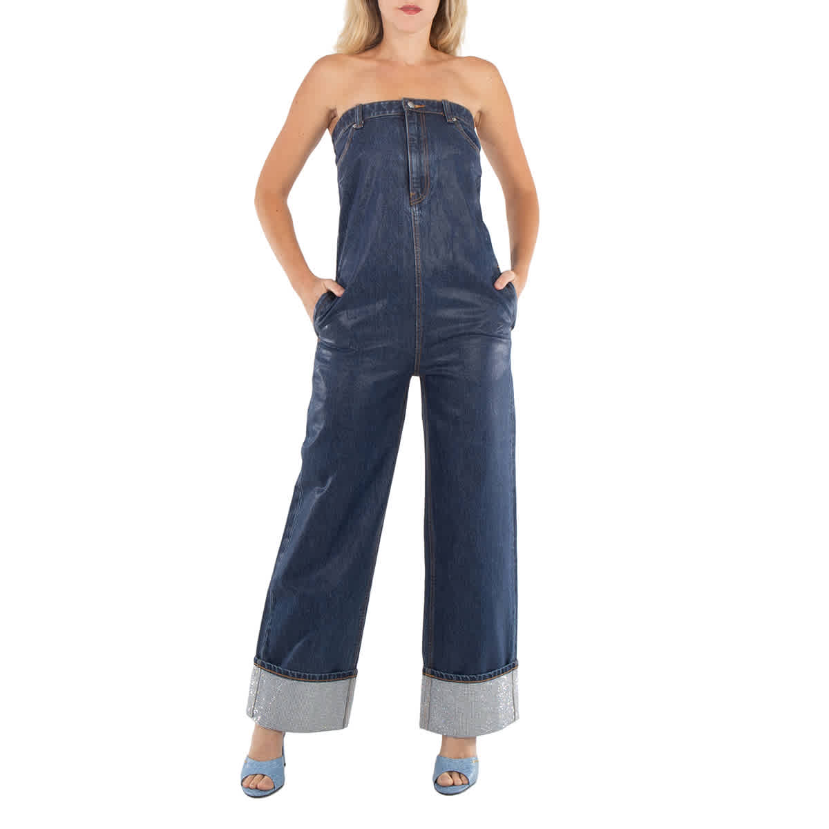 Alexander Wang Ladies Tops. Fashion category: Jumpsuits & Rompers. SKU: 1WC2237501-499. Color: Dark Indigo. Alexander Wang Strapless Denim Jumpsuit. This bodysuit is a denim one-piece with a strapless off-the-shoulder style, a very high waist, side zip pockets, a logo tag on the back and a turn-up hem with appliques. 100% Cotton.