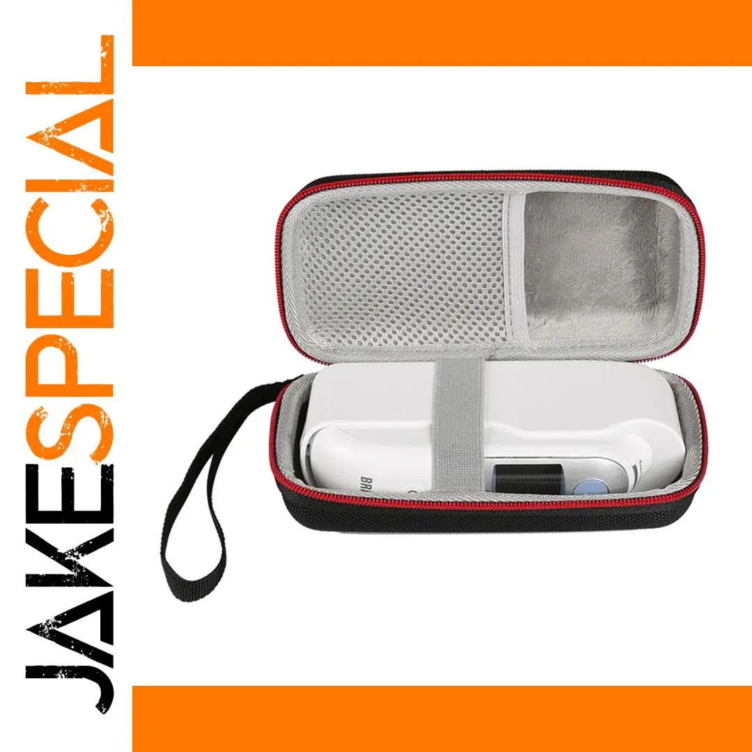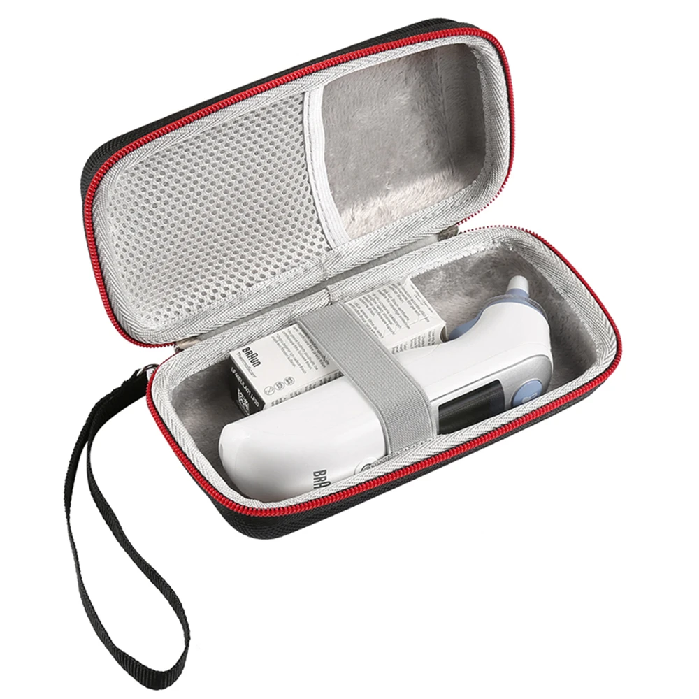 Protect your Braun ThermoScan 7 IRT6520 thermometer with this high-quality, hard EVA protective case. Designed to be both lightweight and durable, it offers excellent shockproof and semi-waterproof features, keeping your sensitive device safe during travel. Its sleek black exterior has a textured surface for a firm grip, while the soft interior lining cushions the thermometer from impacts. The case includes a comfortable woven fabric wrist strap, making it easy to carry on the go. The 360-degree zipper ensures smooth, effortless access to your device and accessories. With extra space for small cables or probes, this case combines practicality with modern style, ensuring your thermometer stays secure and protected no matter where you take it.Key features of this Braun ThermoScan 7 case