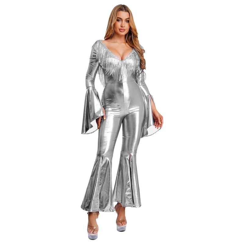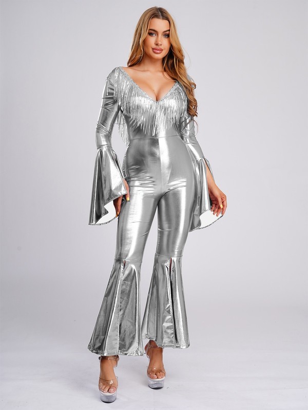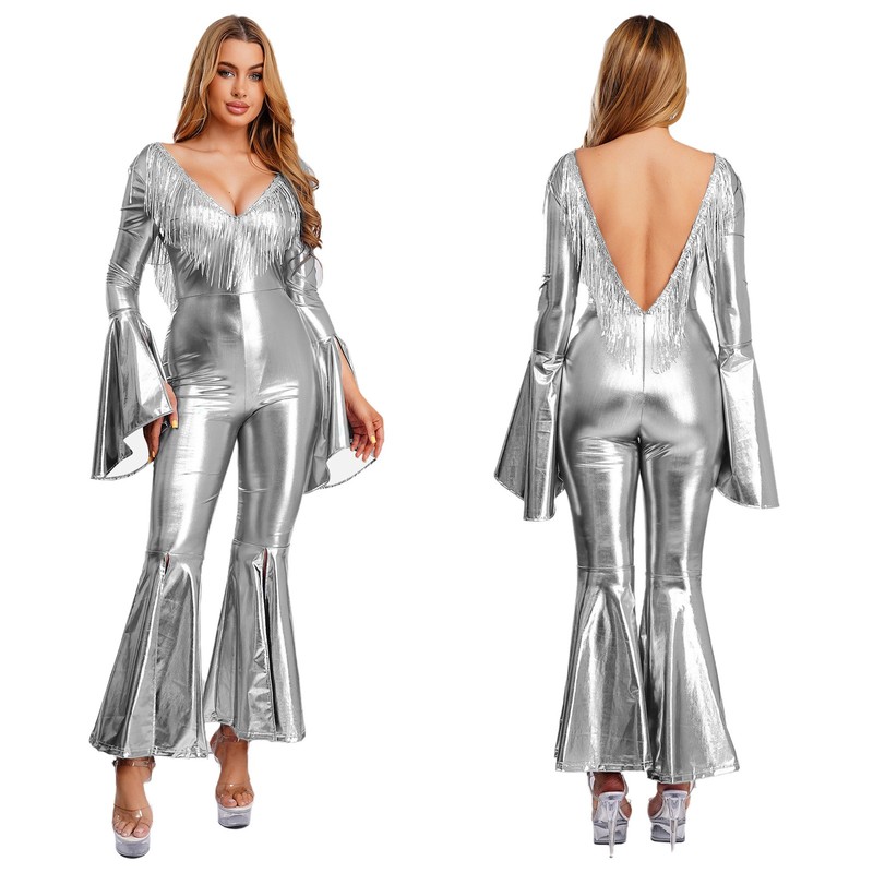 Made from a blend of polyester, PU, and spandex, this jumpsuit offers durability, flexibility, and a comfortable fit, ensuring you can move freely on the dance floor.