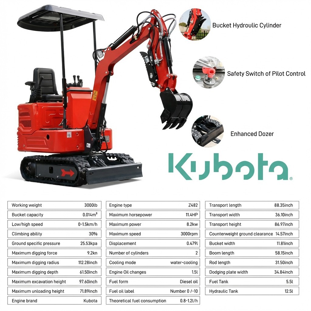 Introducing the DigMaster 1.4 Ton Mini Excavator—your ideal partner for construction, landscaping, and agricultural projects. Powered by a reliable Kubota Z482 diesel engine and featuring a precision hydraulic pilot control system, this machine delivers powerful performance in a compact, maneuverable design. It’s EPA certified for emissions compliance, making it suitable for use across North America.