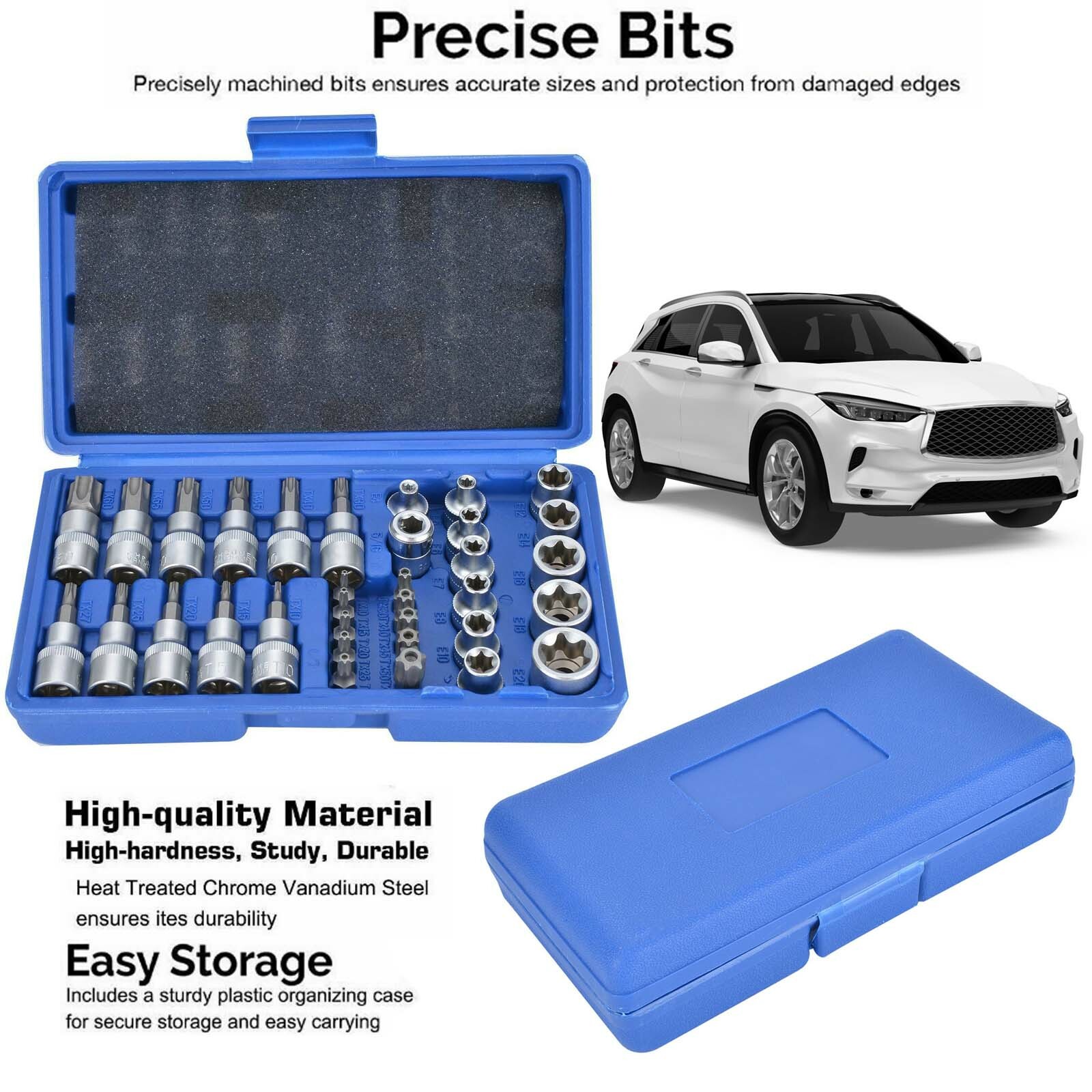 Torx Bit Socket and E-Torx Socket have various sizes fit your fasteners and prevent damages; precision-machined bits ensure accurate sizing to fit your needs and to provide superior torque and hardness.