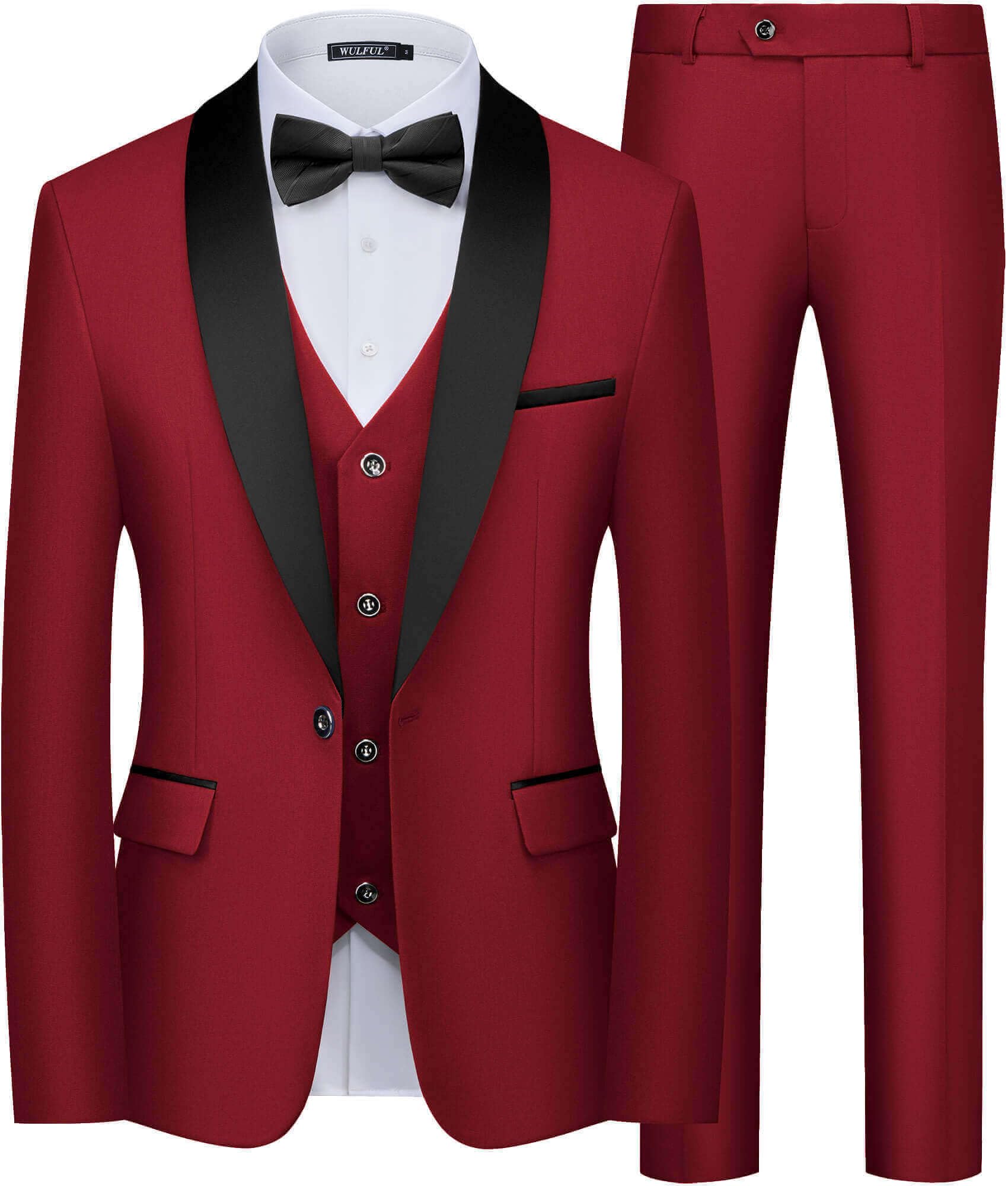 WULFUL Men's 3 Piece Suits Slim Fit Tuxedo Suit Set One Button Shawl Lapel Blazer Jacket Vest Pants Set for Prom, Business Red