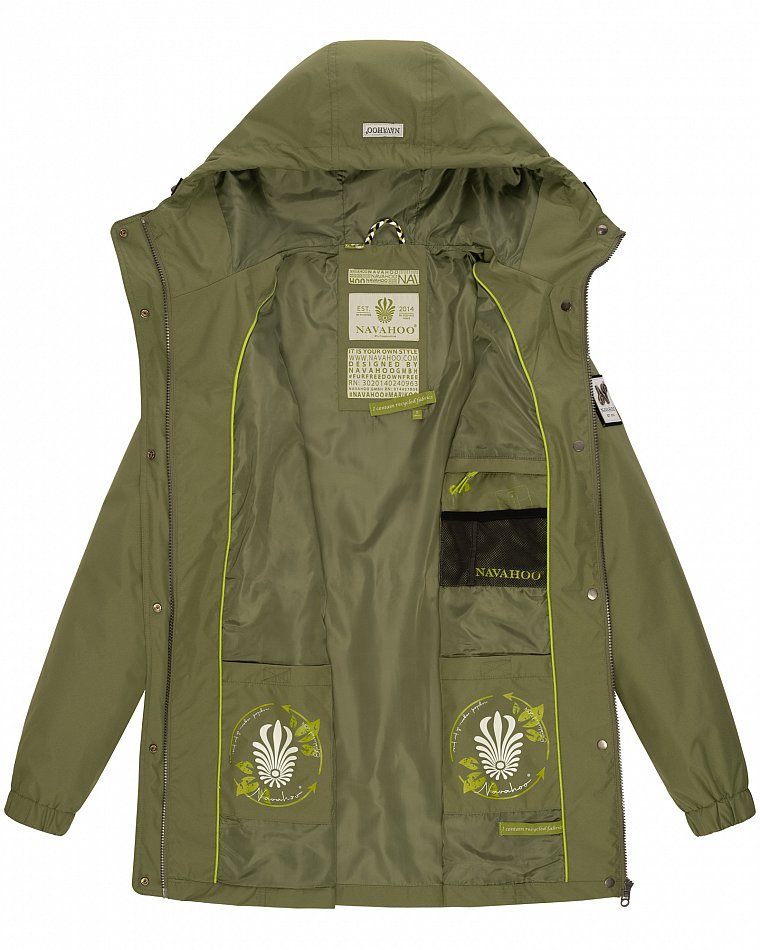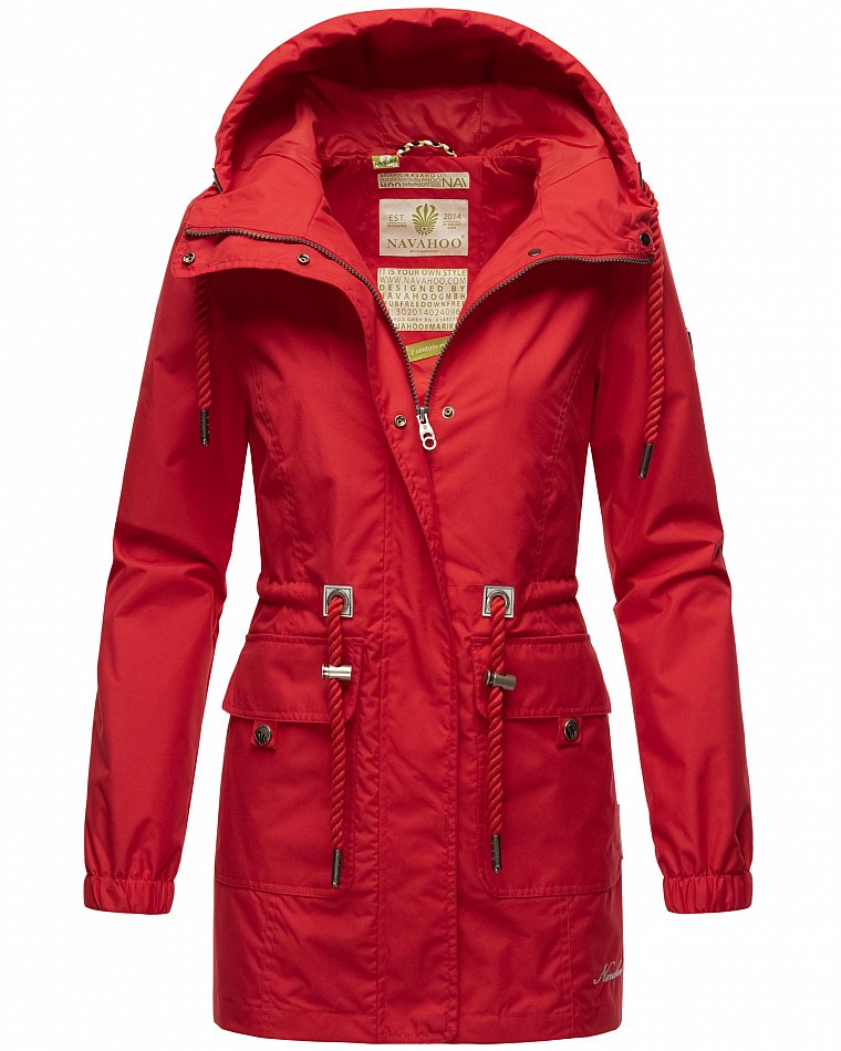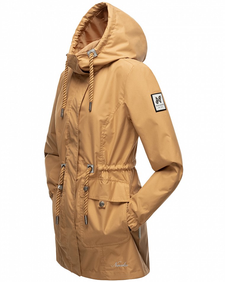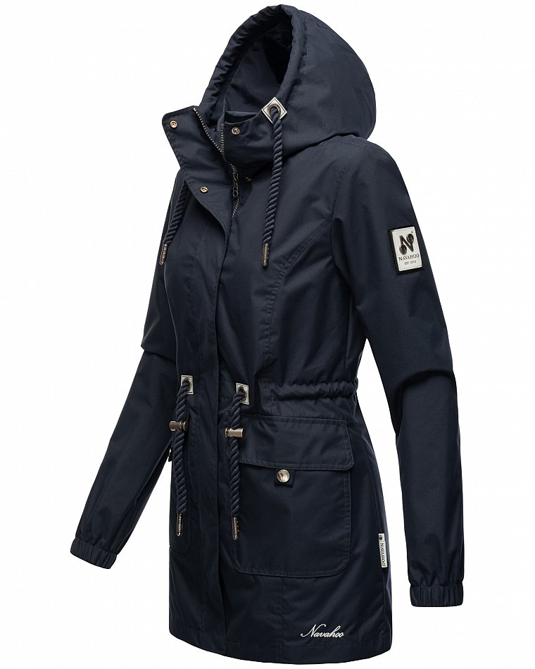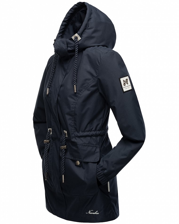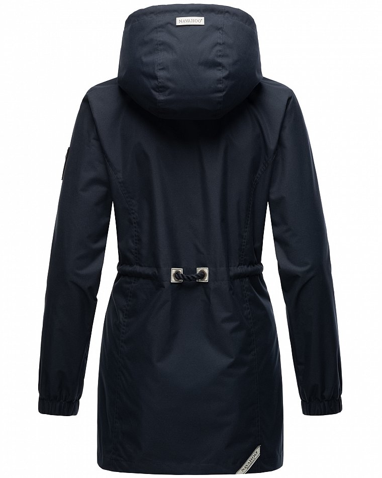 Parka mi-saison ultralégère pour femme fabriquée à partir de matériaux recyclés. L'anorak durable est entièrement fabriqué à partir de matériaux recyclés. Le style léger et élégant est parfait pour la mi-saison, mais convient également pour les fraîches journées d'été. Les larges cordons sur la capuche et le cordon de serrage à la taille, qui rappellent de petites cordes, attirent le regard et ont une finition métallique. Les applications sur la ceinture et les œillets avec le logo Navahoo en relief attirent également le regard. Les tirettes de fermeture éclair Navahoo et les boutons-pression avec gaufrage Navahoo complètent le design. Le look subtil du manteau de transition convient à de nombreux styles et combinaisons. La doublure lisse et soyeuse est ornée de détails contrastés.