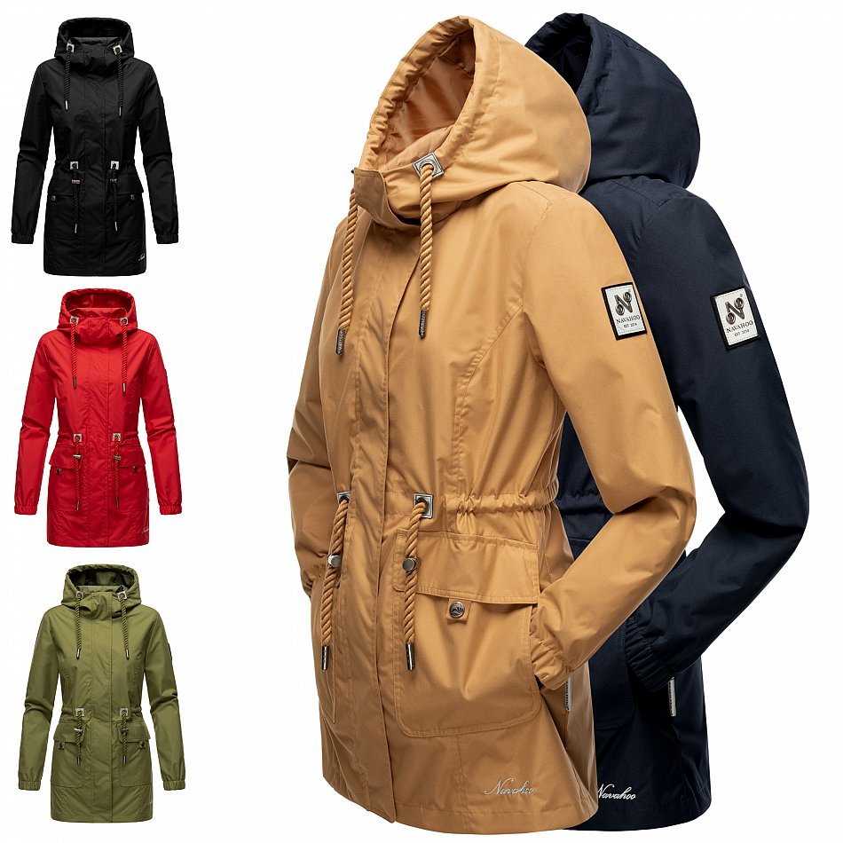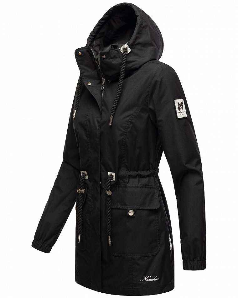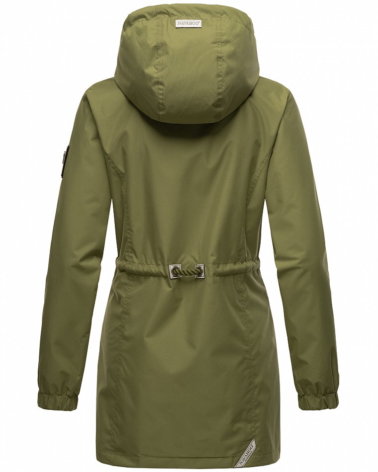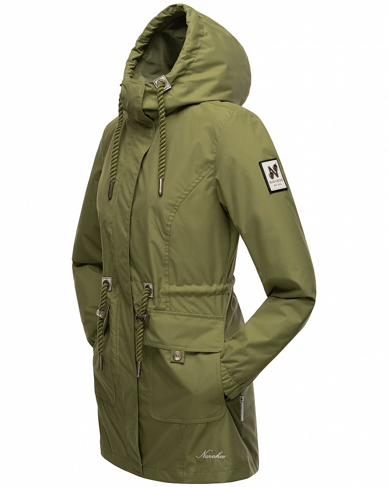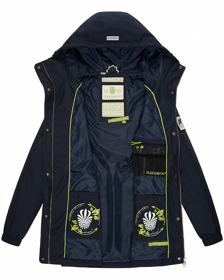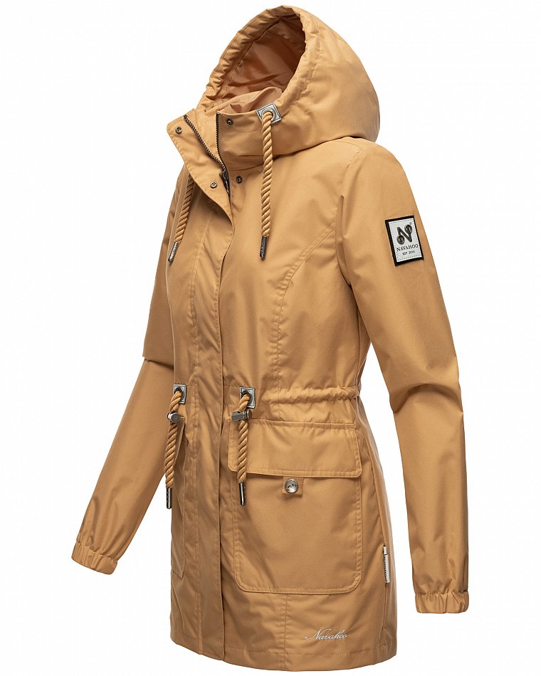 Parka mi-saison ultralégère pour femme fabriquée à partir de matériaux recyclés. L'anorak durable est entièrement fabriqué à partir de matériaux recyclés. Le style léger et élégant est parfait pour la mi-saison, mais convient également pour les fraîches journées d'été. Les larges cordons sur la capuche et le cordon de serrage à la taille, qui rappellent de petites cordes, attirent le regard et ont une finition métallique. Les applications sur la ceinture et les œillets avec le logo Navahoo en relief attirent également le regard. Les tirettes de fermeture éclair Navahoo et les boutons-pression avec gaufrage Navahoo complètent le design. Le look subtil du manteau de transition convient à de nombreux styles et combinaisons. La doublure lisse et soyeuse est ornée de détails contrastés.