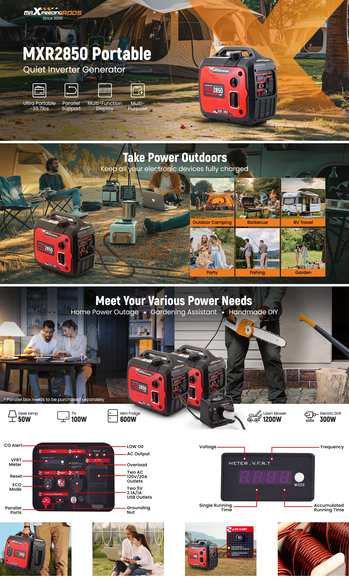 【Parallel Ready】 Two generators can be used in parallel, use a parallel kit(need purchase separately) enables this generator to connect with our another generator to double your output.