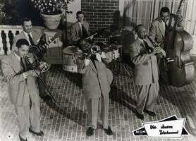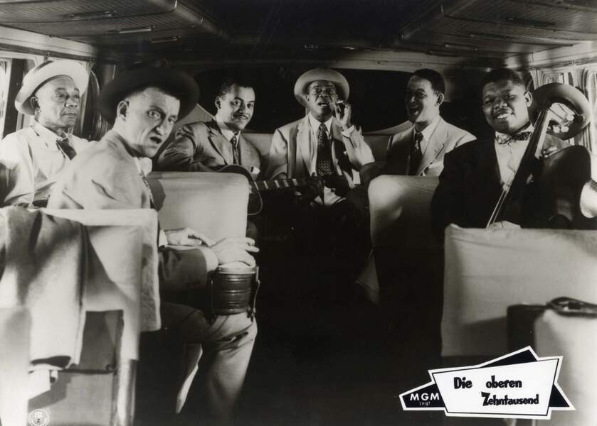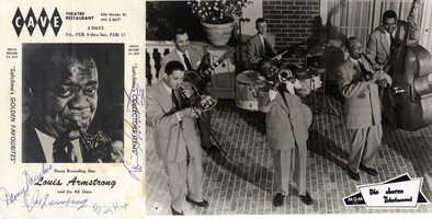 Signed vintage program for a performance of `Louis Armstrong and his All Stars`, Cave Theatre Restaurant (Vancouver), (early 1960s), 5,75 x 9 inch, signed by Louis Armstrong in blue ink "Louis Armstrong" - also signed by Armstrong's band members Danny Barcelona (1929-2007), Joe Darensbourg (1906-1985) and Billy Kyle (1914-1966) in blue ink, with a horizontal fold and mild stains to the lower right corner - in fine condition. Accompanied by three unsigned vintage publicity photographs (in German) of the 1956 musical romantic comedy film `Die oberen Zehntausend` (=`High Society`), (3x) 11,75 x 8,5 inch.
