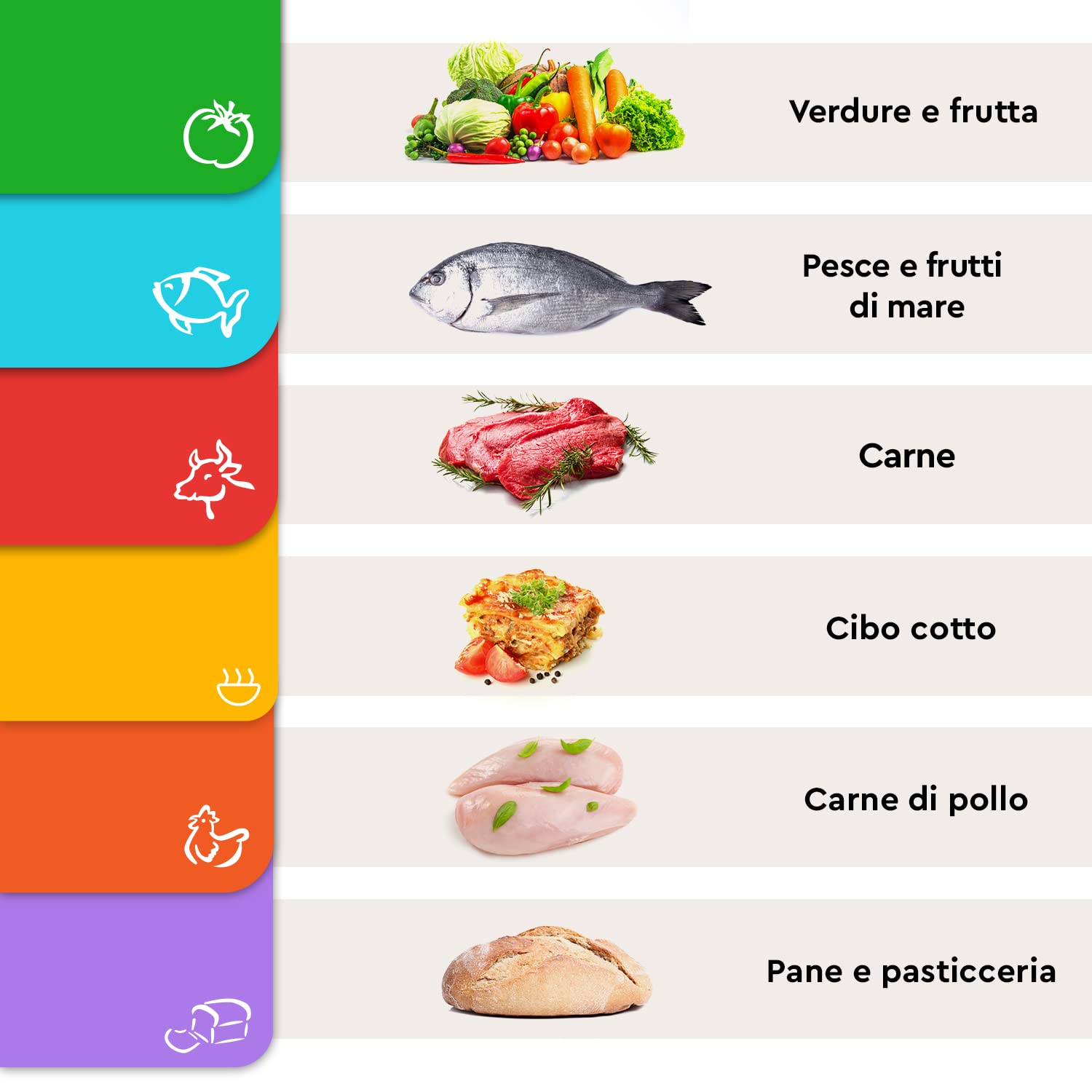 EVITA LA CONTAMINAZIONE INCROCIATA - Viene fornito con 6 taglieri codificati a colori con icone di cibo. Aiuta ad evitare la contaminazione incrociata e a mescolare il gusto del cibo per la salute tua e della tua famiglia