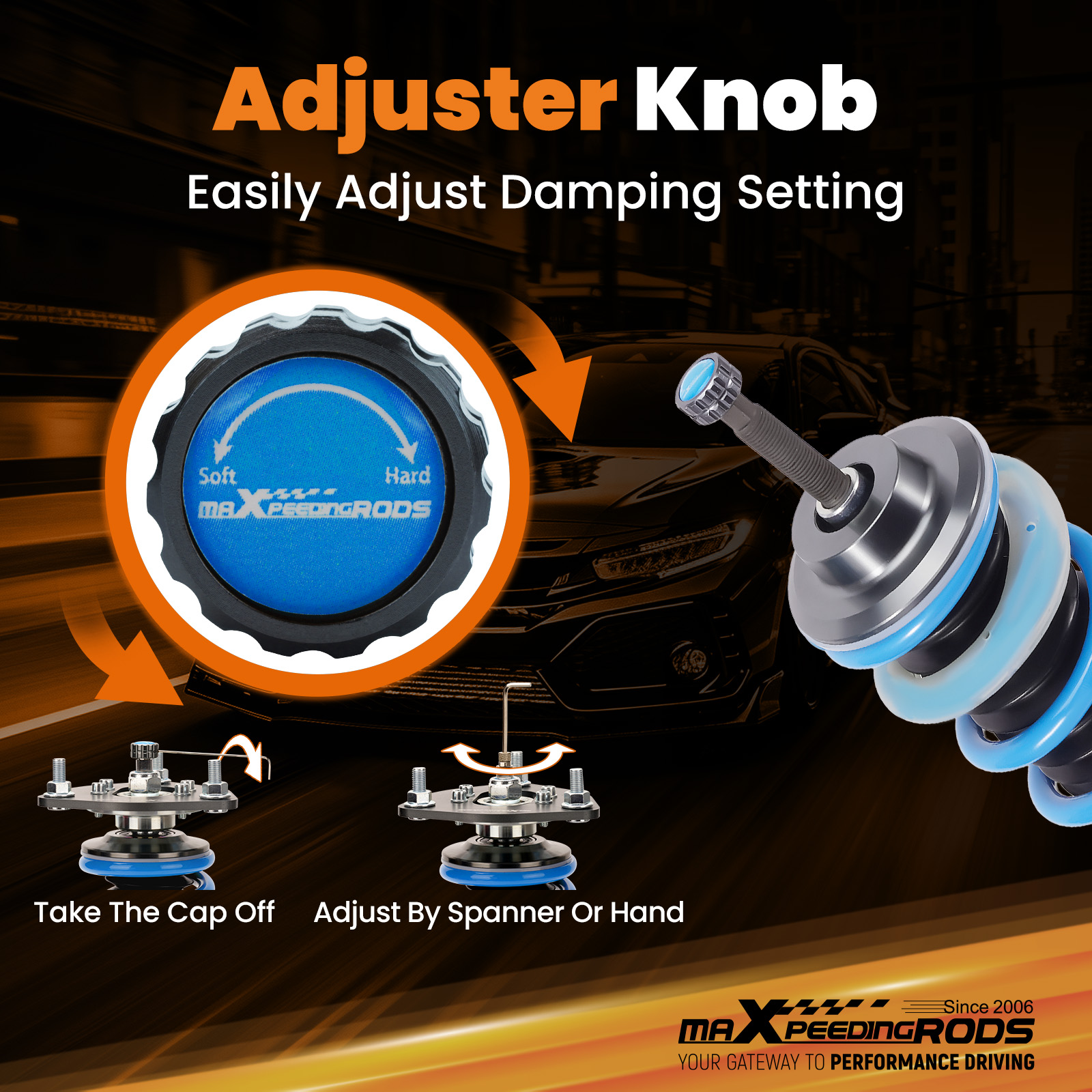 4. 24 Clicks of Rebound Adjustments -- This allows you the ability to perfectly dial in your coilovers system. For a nice comfortable driving, set damping to full soft. For more spirited driving, set it to 16 clicks. For occasional track days, set it to full stiff.