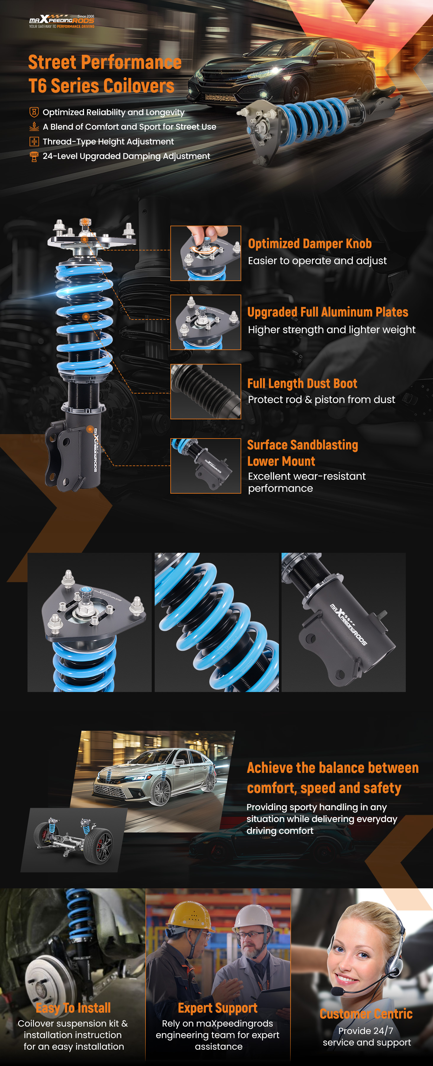 Founded in 2006, MaXpeedingrods is a trusted global brand specializing in a full range of high-performance automotive parts. With a strong focus on suspension and coilovers, we hold a leading market share online and are widely recognized by enthusiasts worldwide. All products are engineered for reliable performance, durability, and perfect fitment, serving daily driving, street tuning, and light track use.