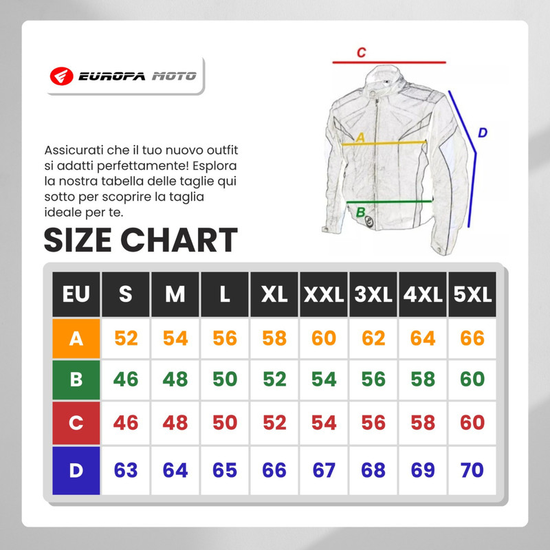 - Per evitare resi, ti consigliamo di misurare una tua giacca attuale e confrontarla con le nostre misure S, M, L, XL, 2XL, 3XL, 4XL.