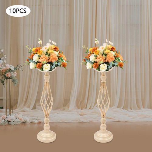 This set of golden candle holders brings an aura of luxury and warmth to wedding celebrations and formal dinners. Meticulously crafted from premium materials, each piece maintains its radiant appearance through long-term use. The round base and reinforced structure provide stable support for floral or candle displays, ensuring arrangements remain securely in place from ceremony to reception while elevating the venue with refined opulence.
