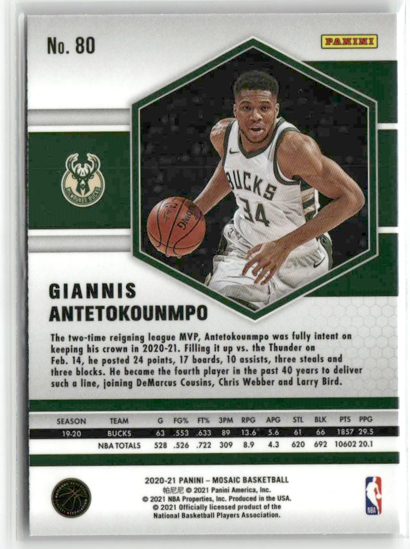 | Giannis Antetokounmpo 2020-21 Panini Mosaic Milwaukee Bucks #80 | ||||||||||||||||