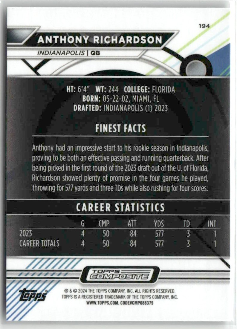| Anthony Richardson RC 2024 Topps Finest Indianapolis Colts #194 | ||||||||||||||||||