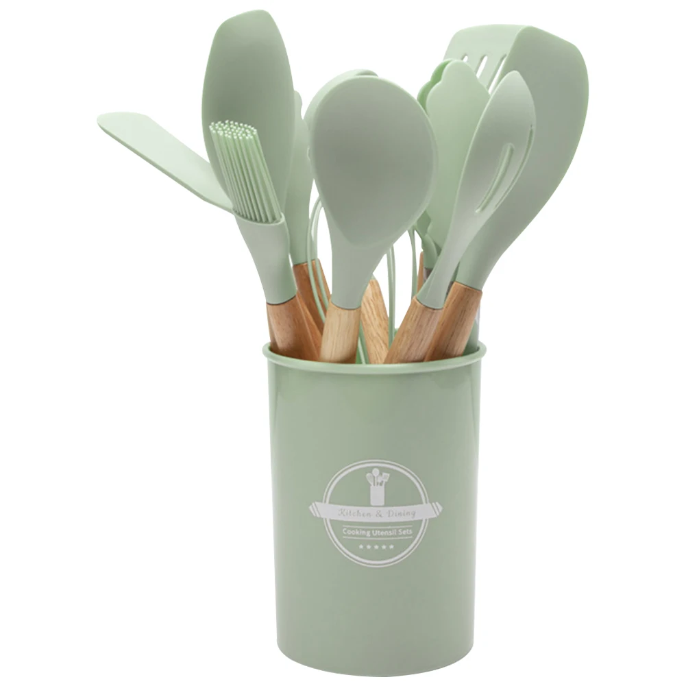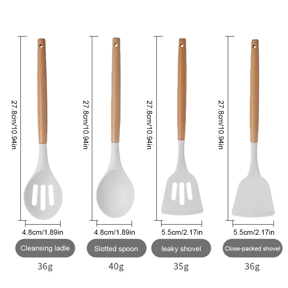 12Pcs Kitchen Utensil Set Heat-Resistant Cookware Wooden Handle Non-Stick Spatula Set Spatula Spoon Brush Whisk Kitchen Supplies Features: 1. Premium Silicone Material: Made from high-quality, heat-resistant silicone, this kitchen utensil set won't damage your cookware. The sturdy material ensures easy cleaning and long-lasting use, making them a reliable choice for all your cooking needs. 2. Heat-Resistant Wooden Handles: Each silicone spatula set features a wooden handle designed to prevent burns. The ergonomic design provides a comfortable grip, ensuring safe and enjoyable cooking experiences every time you step into the kitchen. 3. Versatile and Multi-Functional: This cooking tools kit is for a variety of cooking tasks. From flipping pancakes to stirring soups, these utensils are designed to handle every kitchen scenario, making your culinary adventures more convenient. 4. Space-Saving Storage: This heat-resistant cookware comes with a stylish storage container to keep your kitchen organized. The compact design helps you save space and avoid clutter, ensuring your utensils are always within easy reach when you need them. 5. Convenient for All Cooking Needs: Whether you're a beginner or a seasoned chef, this non-stick spatula set meets diverse cooking requirements. The combination of spatulas, spoons, and other tools ensures you have the right utensil for any recipe, enhancing your cooking efficiency.