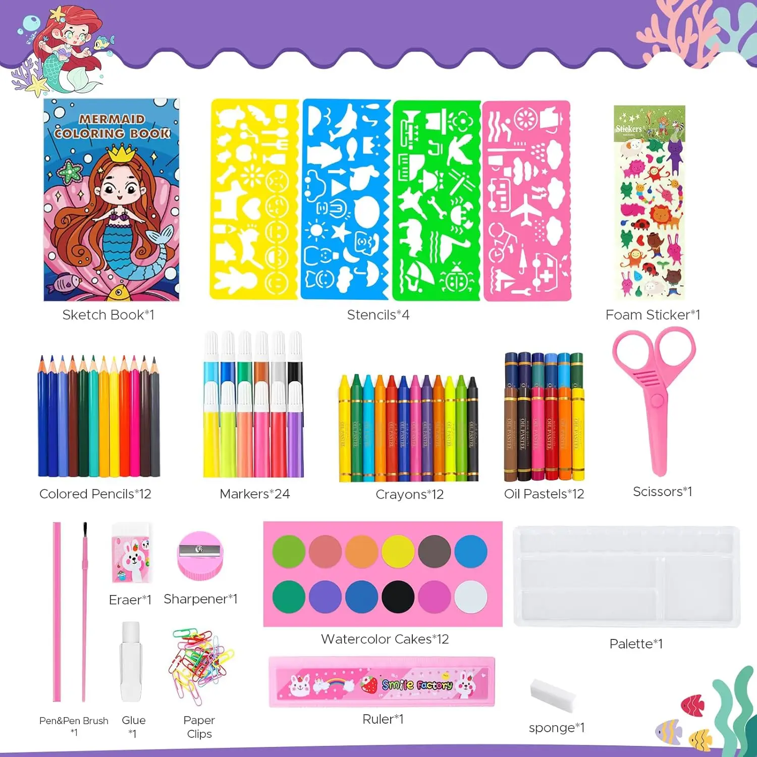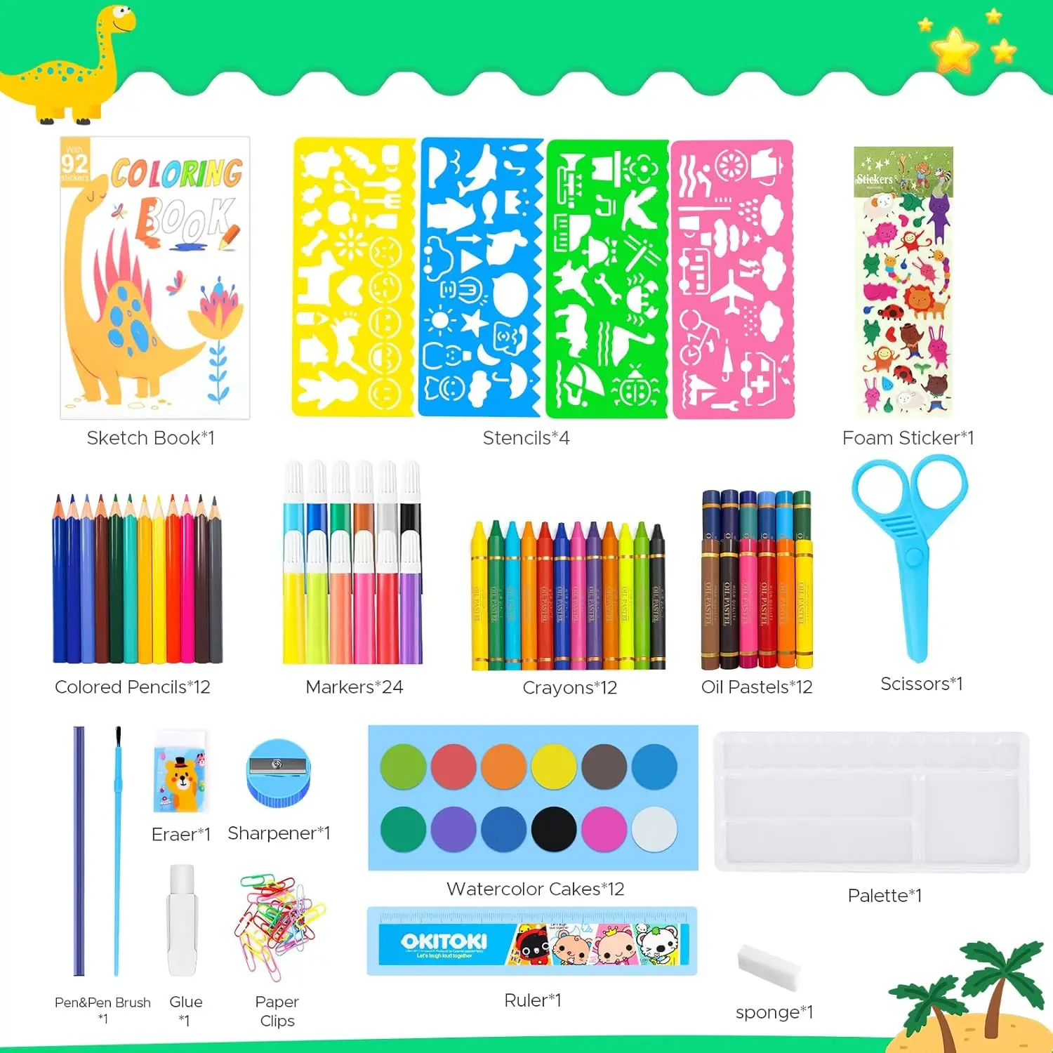 Vibrant Art Supplies for Kids Girls Boys: Our kit includes a stunning array of 24markers, 12 colored pencils, 12 crayons, 12 oil pastels, and 12 watercolor cakes.Your kid will have everything they need to explore various art techniques and express their creativity.