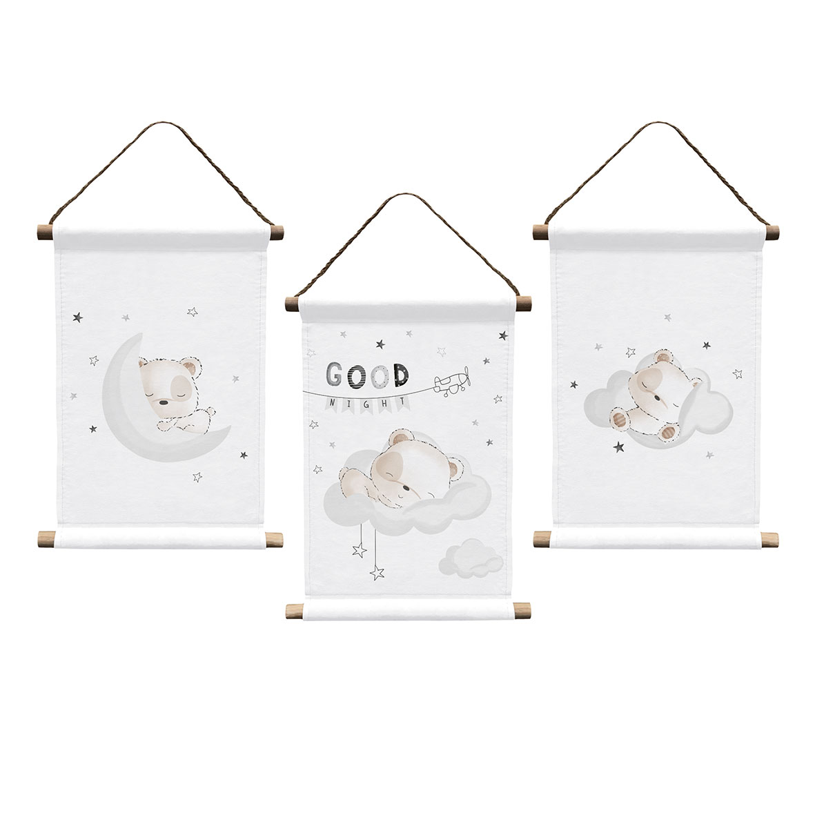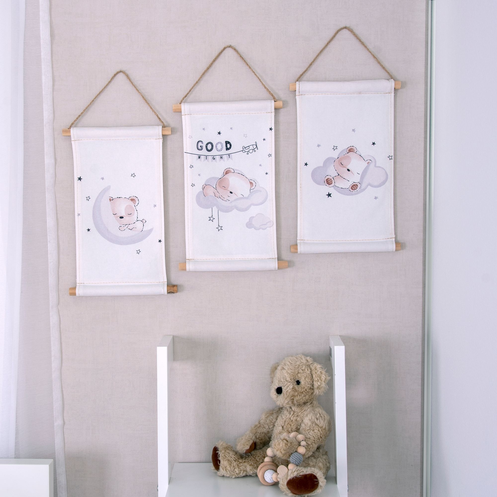 Transformez la chambre de bébé en une oasis de calme avec cet ensemble magique de 3 tableaux muraux. Les motifs conçus avec amour représentent le « petit ours endormi » dans diverses scènes de rêve : endormi sur un croissant de lune, blotti dans de doux nuages et accompagné des mots « Bonne nuit ». Ces éléments décoratifs créent une atmosphère chaleureuse et bien-être parfaitement adaptée à l'heure du coucher des petits explorateurs.