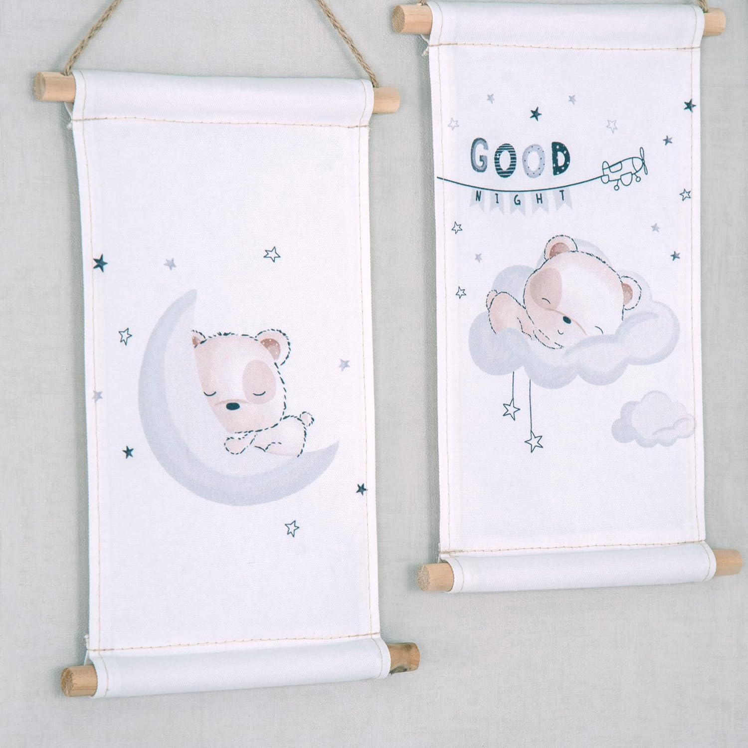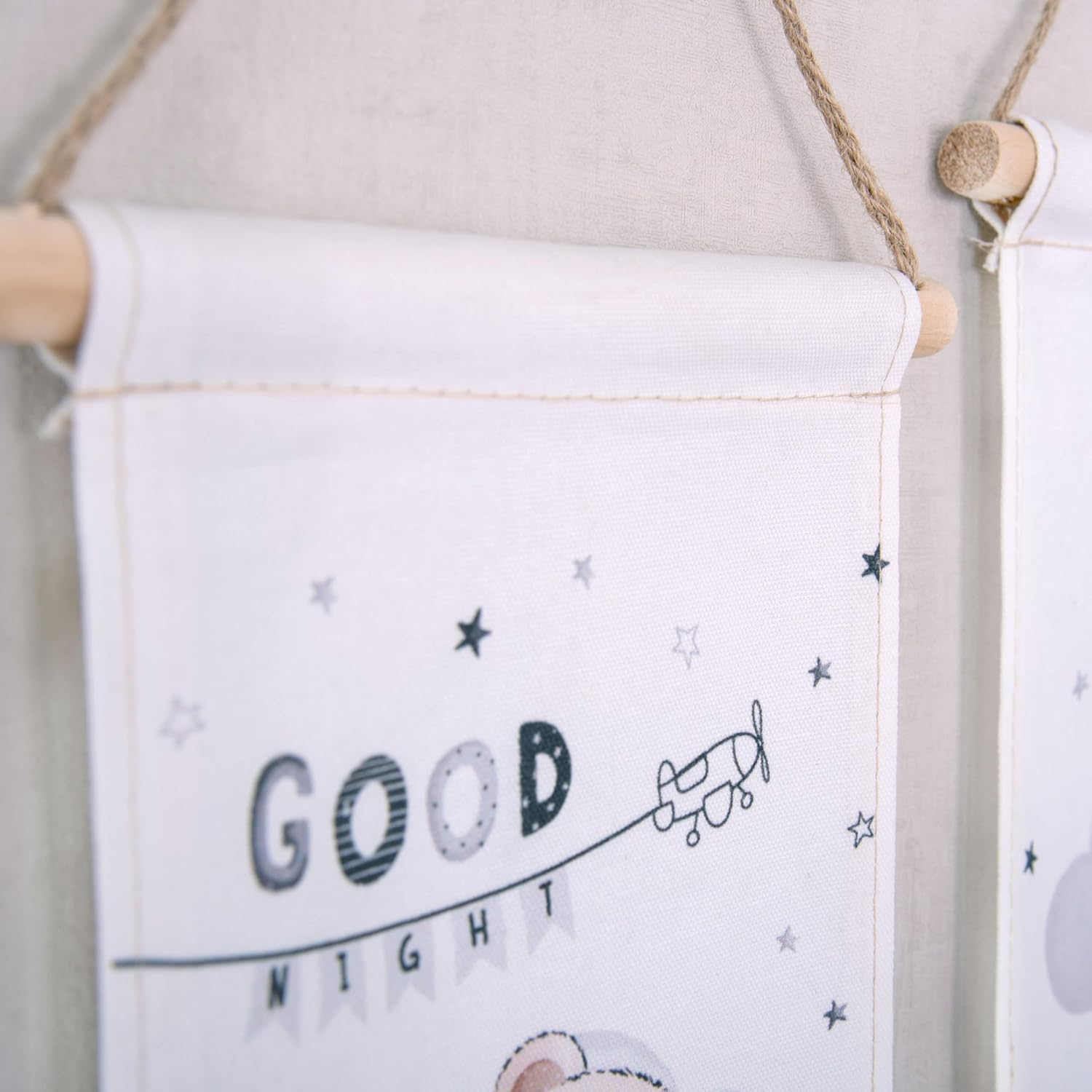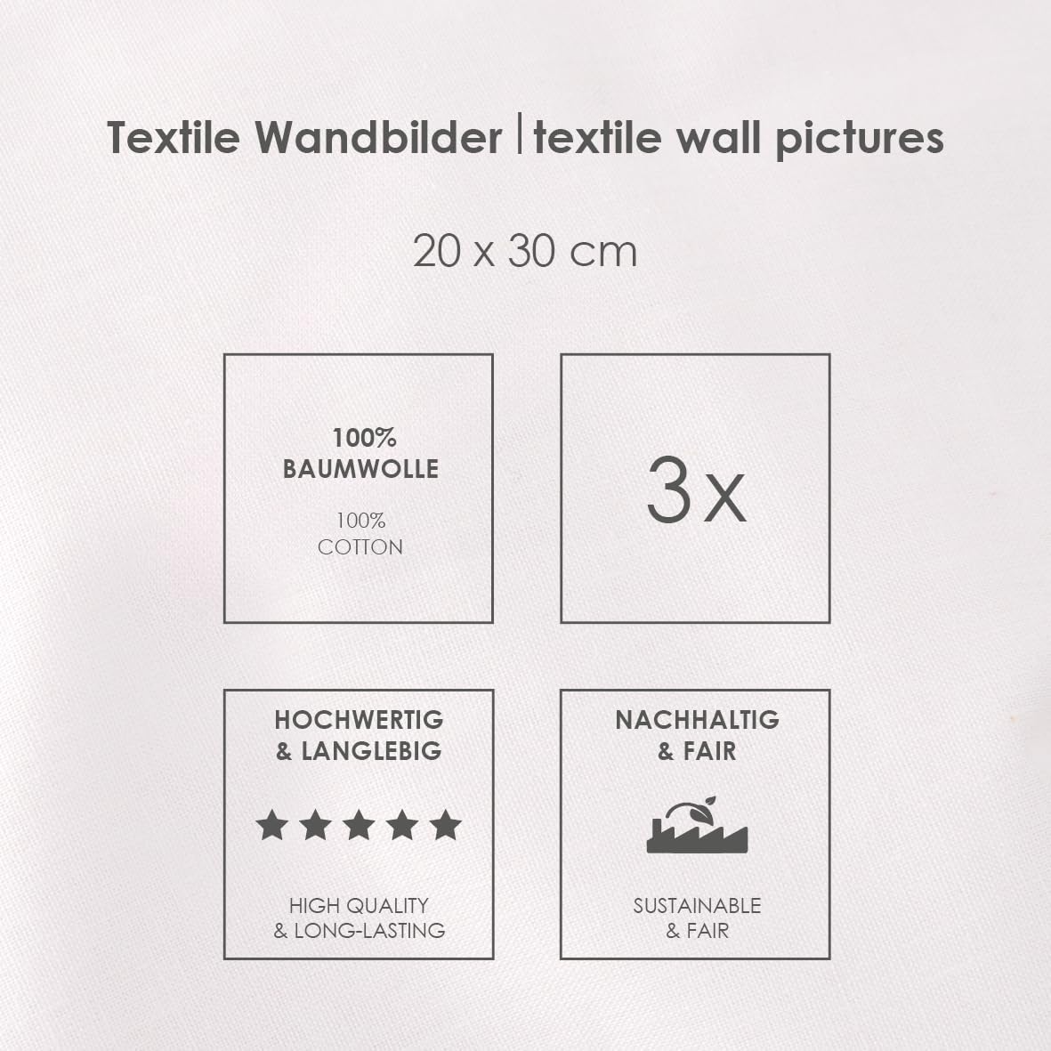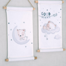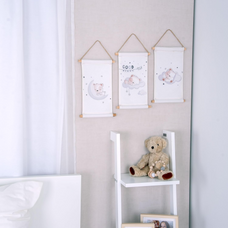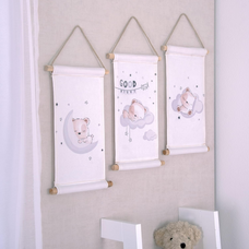 Ces peintures murales de haute qualité sont faites de 100% pur coton et chacun en a deux stables bâtons de bois équipé. La combinaison de textiles doux et de bois naturel confère à la décoration murale un aspect et un aspect haut de gamme. Grâce au cordon pratique, les tableaux peuvent être facilement accrochés et attirent immédiatement l'attention sur n'importe quel mur de la pièce. babybest est synonyme de qualité et de responsabilité pour assurer la sûreté et la sécurité de nos tout-petits.