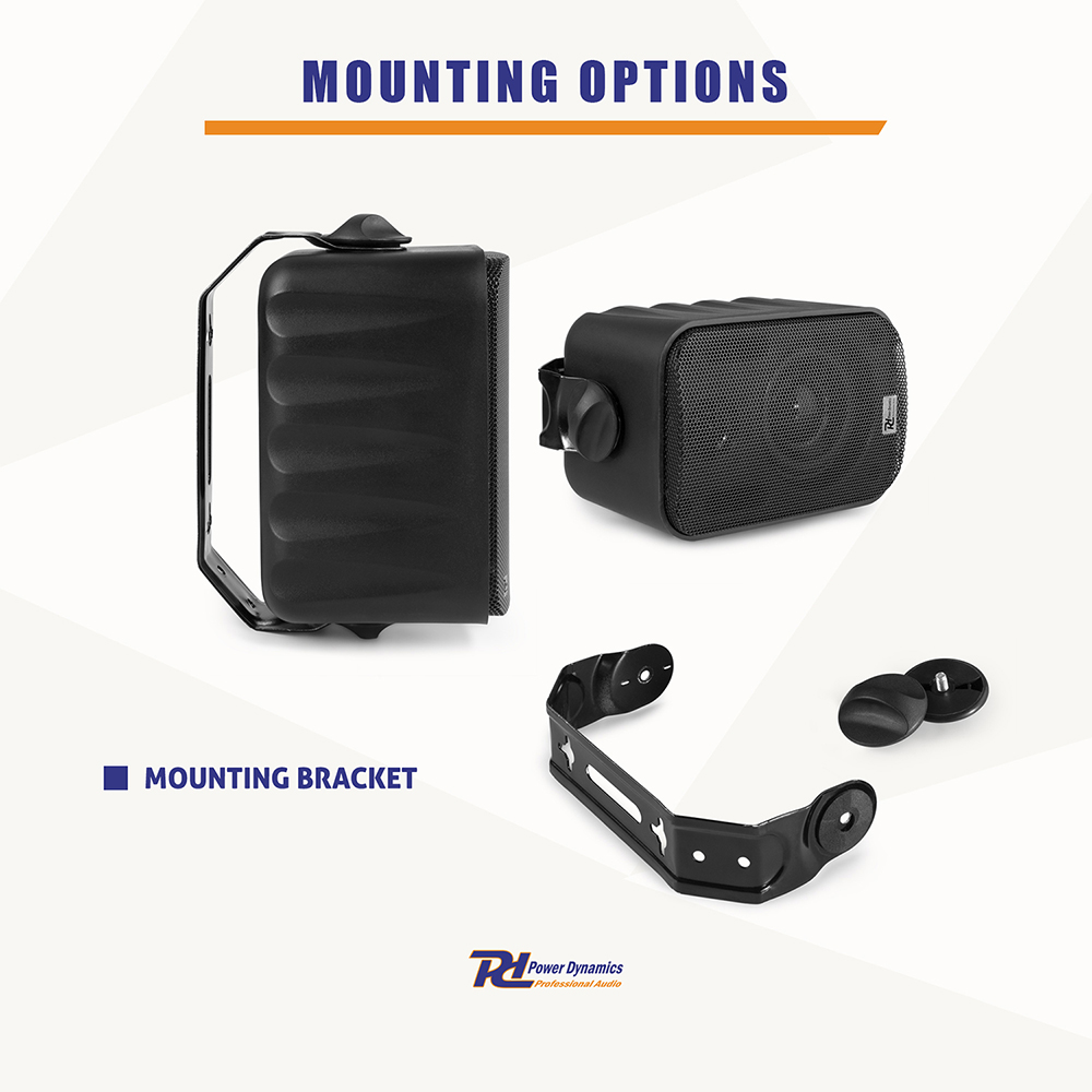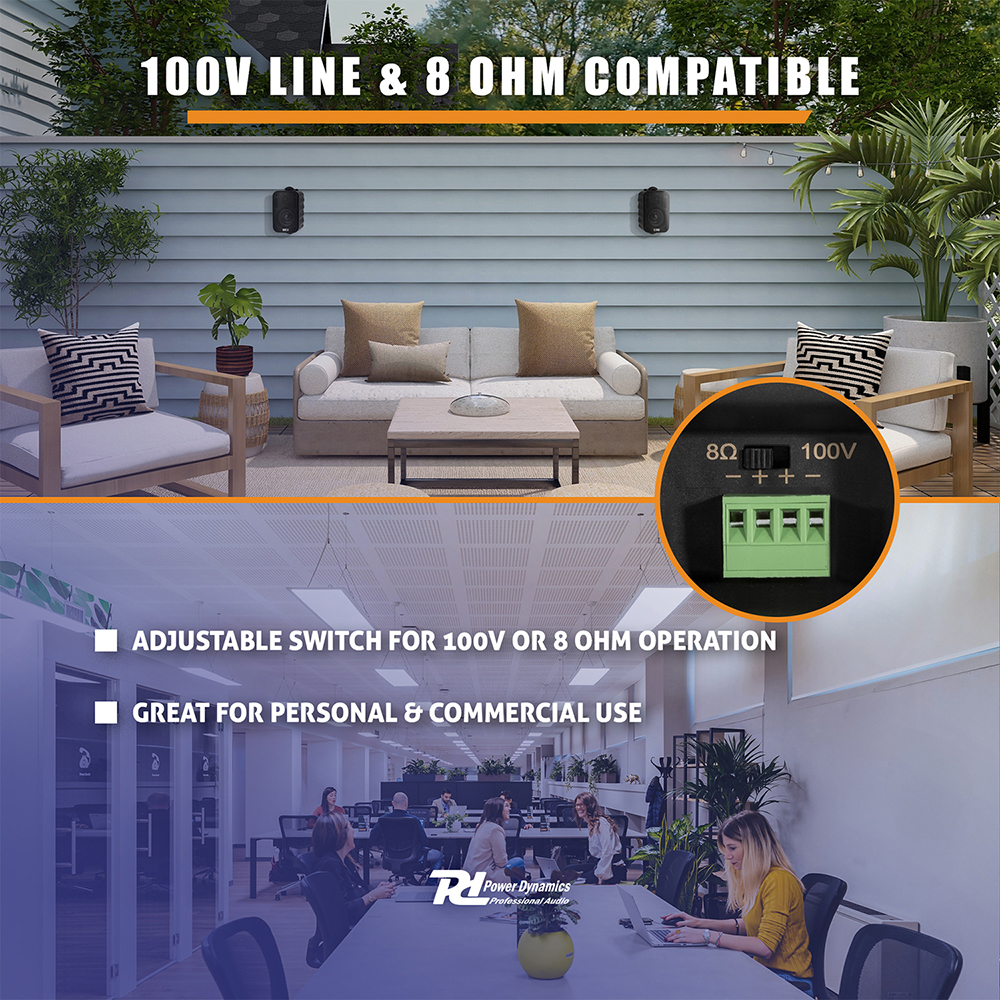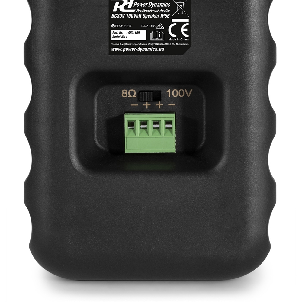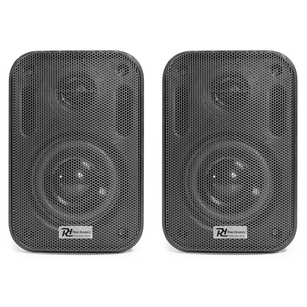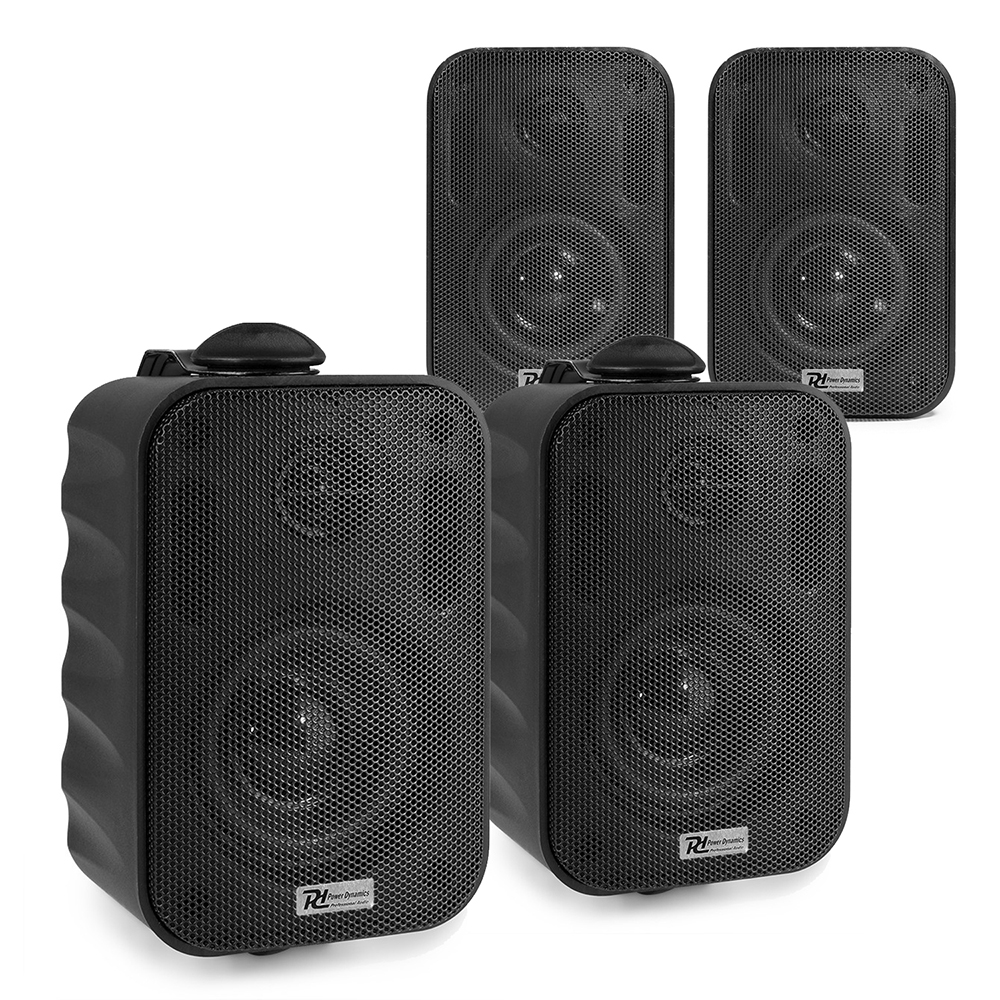 Package Includes 4x Power Dynamics 952.100 BC30V Black Speakers 100V 8 Ohm 3" 60W - IPX5 The BV series indoor wall speakers deliver high-quality sound for music and sound reinforcement in both domestic and commercial installations. Ideal for entertaining areas at home or, for example, in meeting rooms, boardrooms, classrooms, hotels and restaurants. What is 100V line?.Multiple speakers can be connected to a compatible amplifier, how many you can connect will depend on the power output of the amplifier and the power / setting of the speakers used. The total amount of speakers used can not go above the power of the amplifier. The best way to explain the speaker / amp configuration of these systems is to example an equation:1x Amplifier = 100 Watts - 16x Speakers @ 6 Watt Tap Setting = 96 Watts1x Amplifier = 100 Watts - 33x Speakers @ 3 Watt Tap Setting = 99 Watts BBA4821 - Black 3" Wall Speakers Weatherproof Outdoor Garden Background Music 100V (Pair) The Power Dynamics high quality BC Series offers both 100V line and 8 ohm system compatibility with easy rotary switch power tap selection. All models are IPX5 rated for outdoor applications. The grilles and brackets are constructed from marine grade aluminium and painted with long lasting industrial strength powder coat to withstand harsh environments. Ideal for outdoor events, swimming pools, terraces, garden areas and marine or boat use. Features