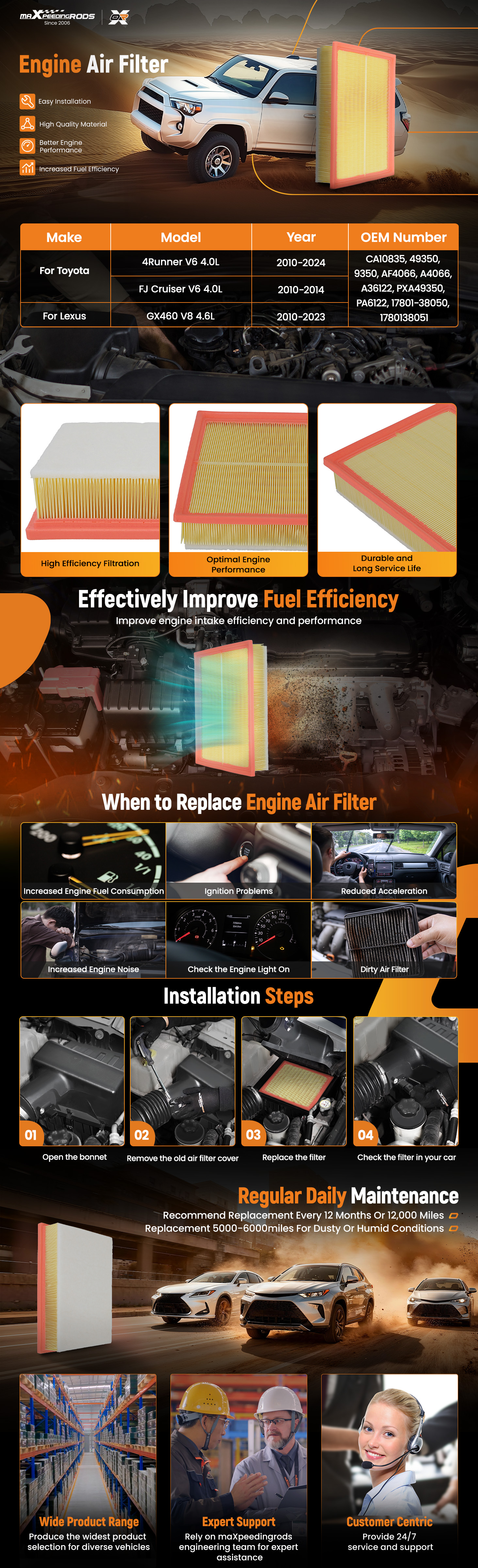 Excellent Protection: Various damaging particles and dust entering your vehicles engine and will causing increased engine wear, replace engine air filter entraps these particles, give your car a safer, cleaner, and quality protect. Prevent the engine from suck in a lot of damaging particles dduring the working process.