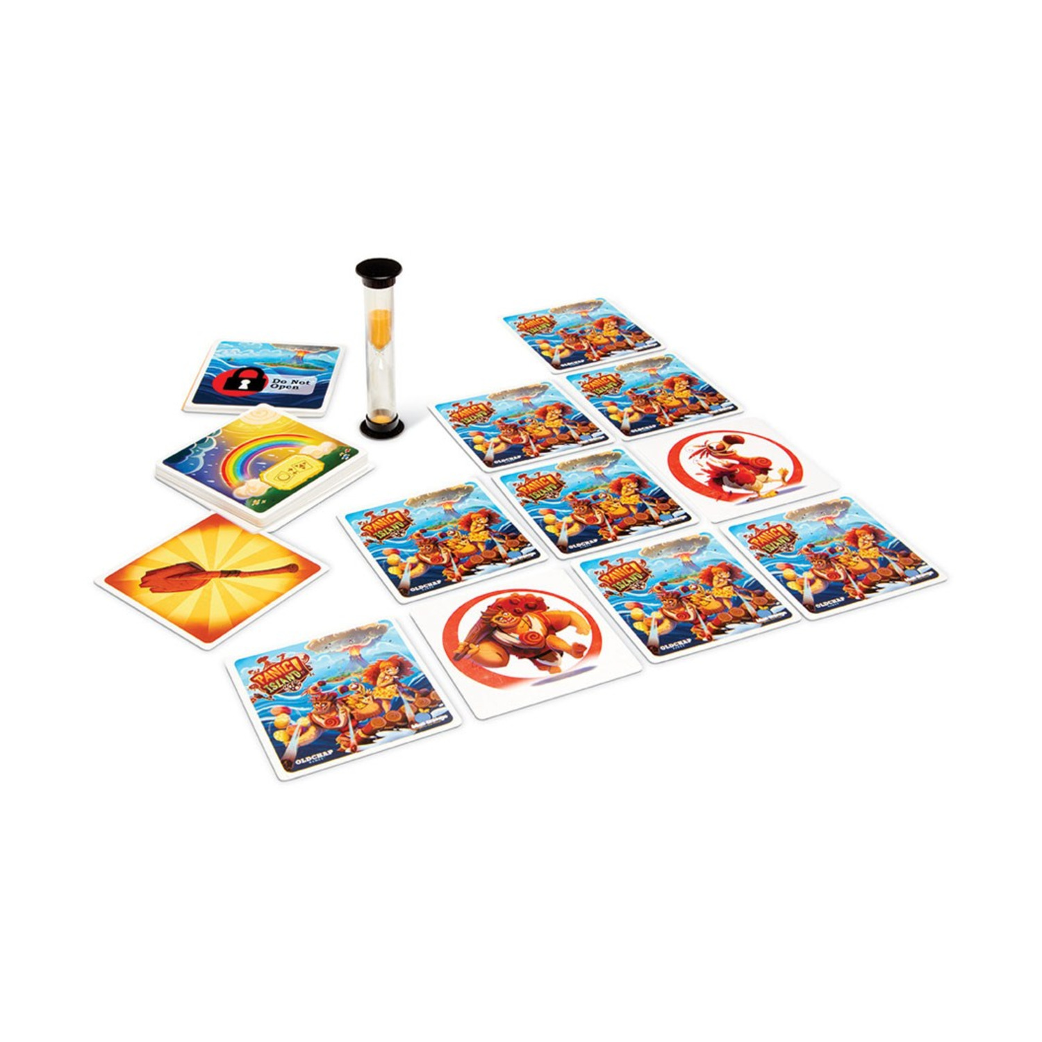 Hurry! The volcano on your island is going to erupt and the inhabitants are counting on you to save them before 2 minutes are up! Flip 2 cards at a time and remember their location to create the right pairs, don't get delayed by the wacky action cards, and find the Raft and Paddle to escape safely! This unique cooperative race takes players on a frantic adventure they will only survive with strategic teamwork and memory!