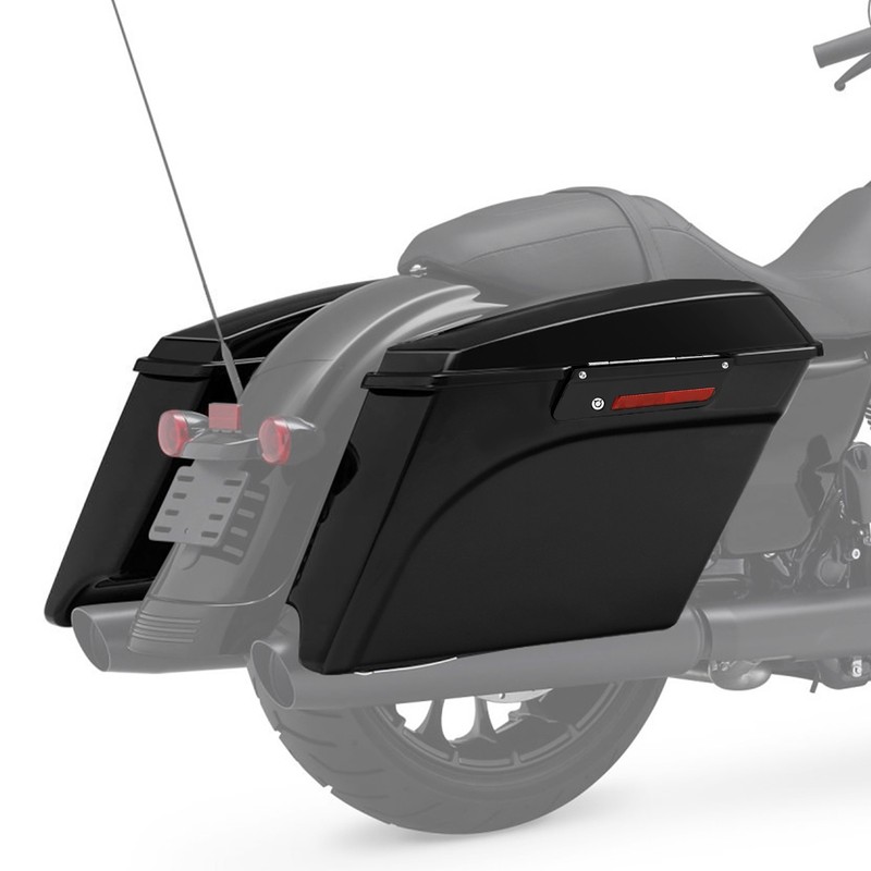 Saddlebags are stretched 5" longer than stock to cover the muffler front to back and give that stretched look