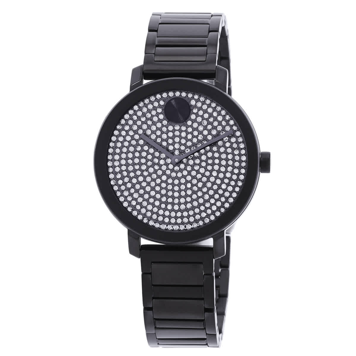 Gunmetal Crystal Pave dial enhanced by black hands. Black IP stainless steel case with a black ip stainless steel band. Quartz movement. 30 meters / 100 feet water resistance. Fixed bezel. Scratch Resistant K1 crystal. Solid caseback. Fold Over with Safety Release clasp. Pull / Push crown. Case size 34 mm. Movado 3601153 Bold Evolution 2.0 Watch.