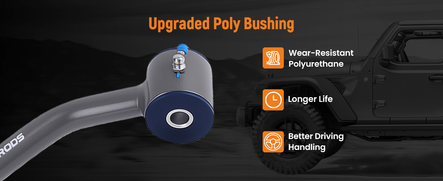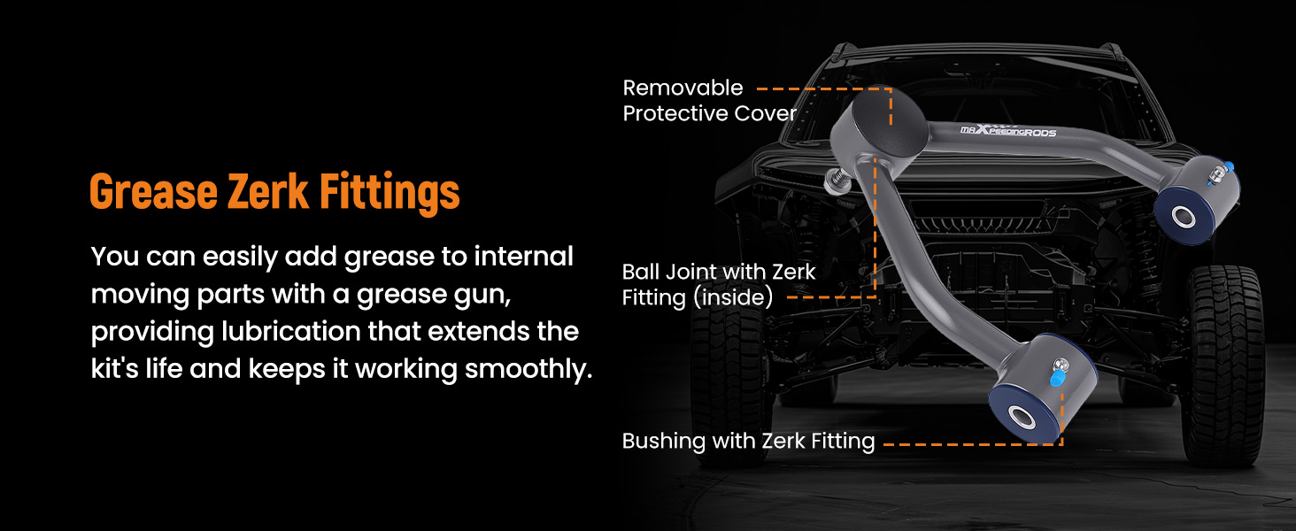 Upgraded Polyurethane Bushings, zert fittings for easy lubrication. Ball joints come with 90-degree zerk fittings.
