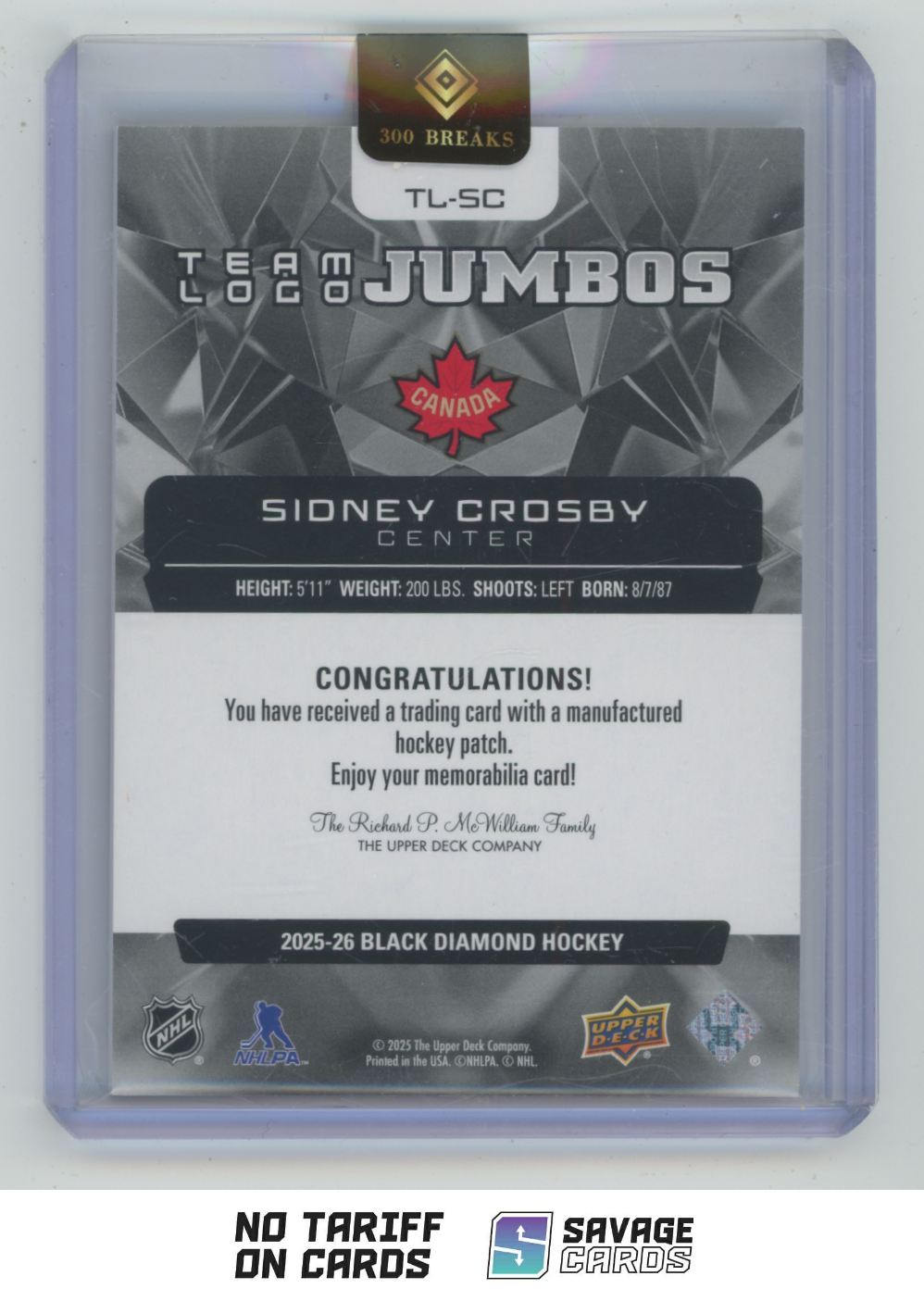 | 2025-26 UD Black Diamond Team Logo Jumbos Sidney Crosby #TL-SC Canada | ||||||||||||||||