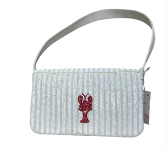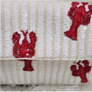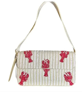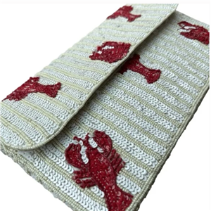 Stylish women's bag featuring a unique beaded red lobster on a white sequin background.
