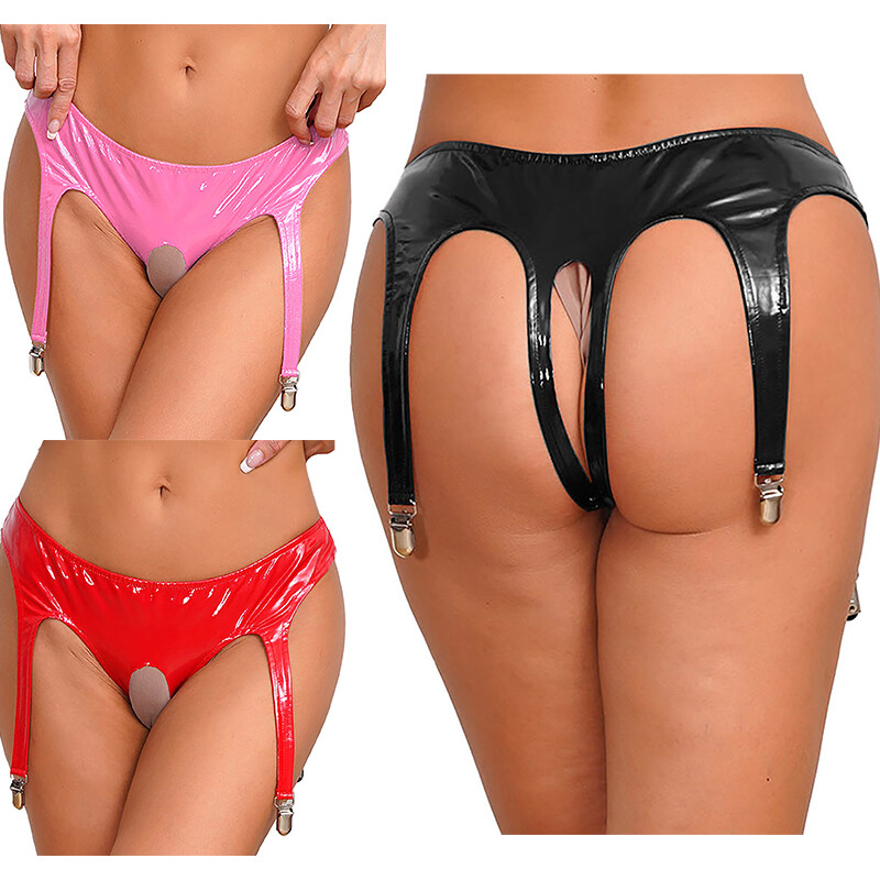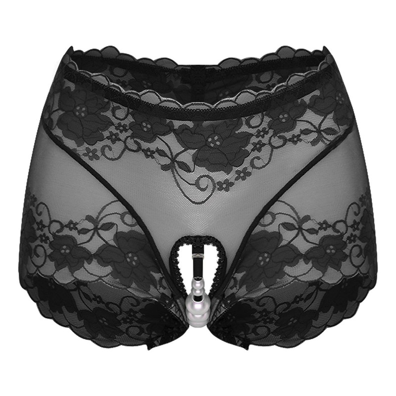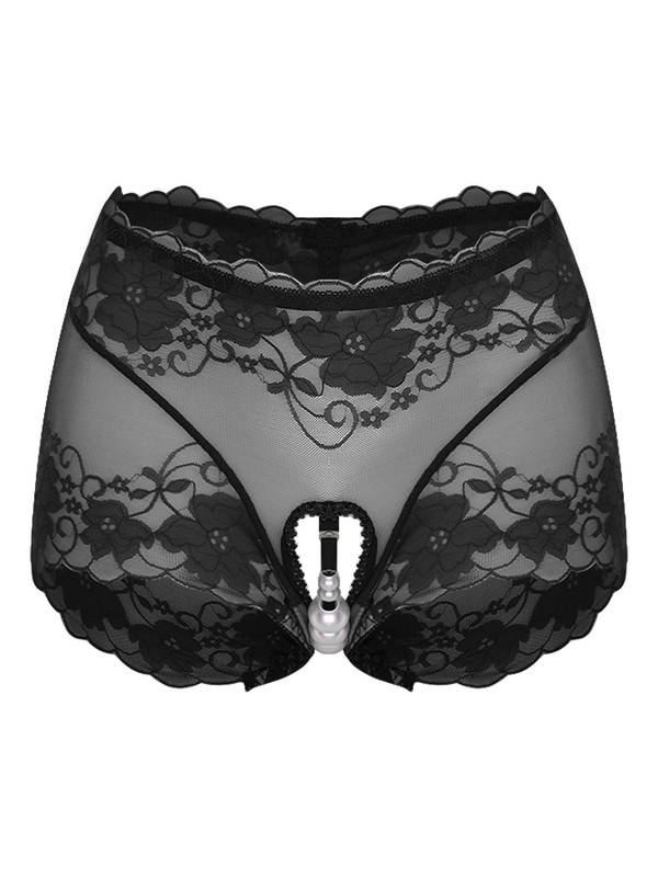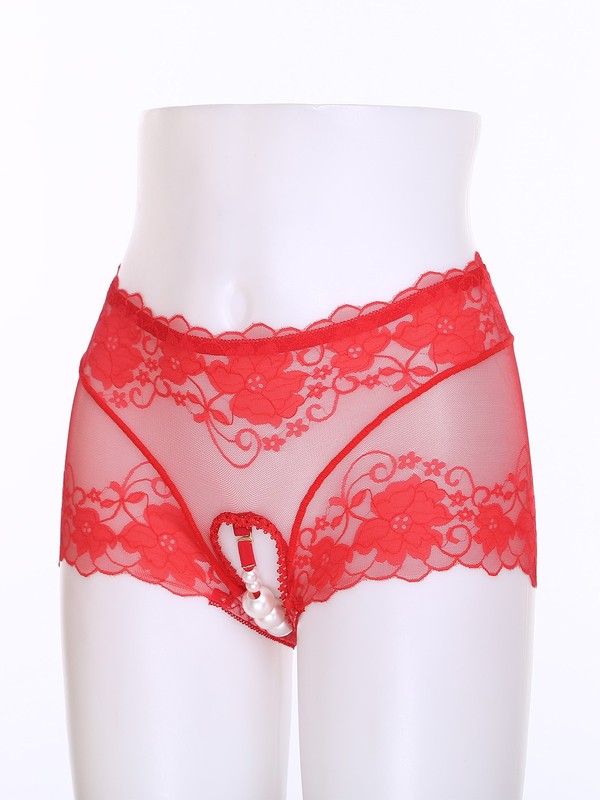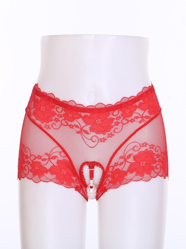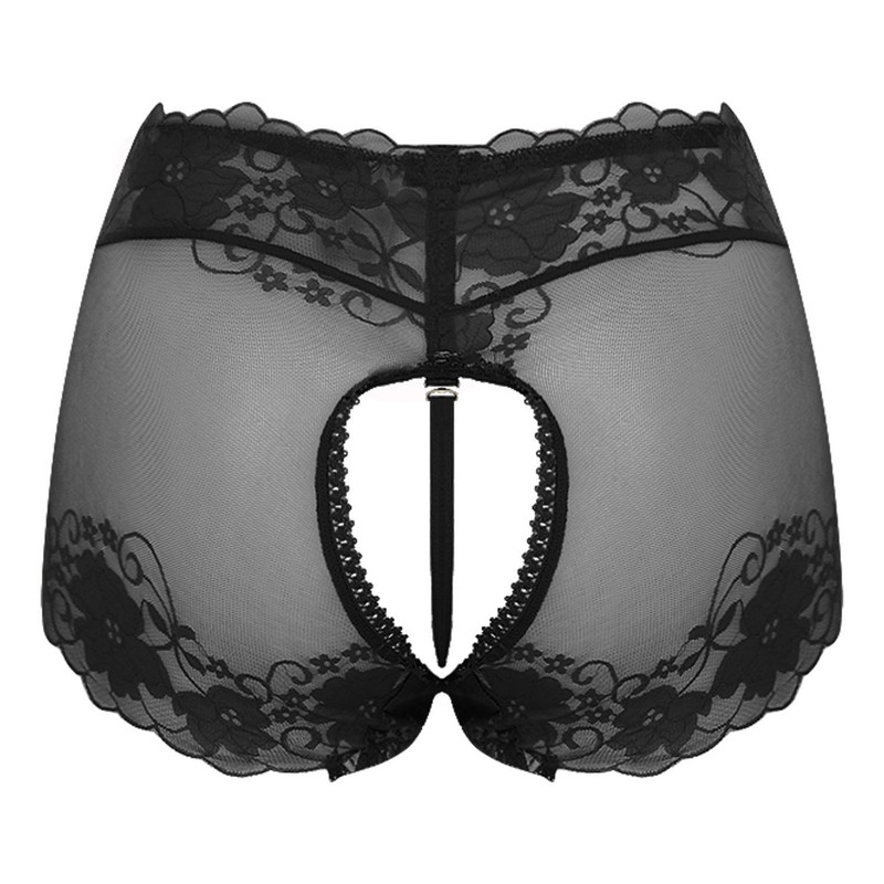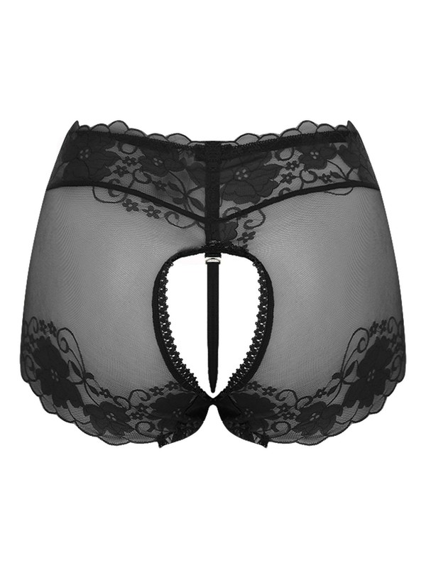 Front with see-through lace design, open butt and minimal coverage.