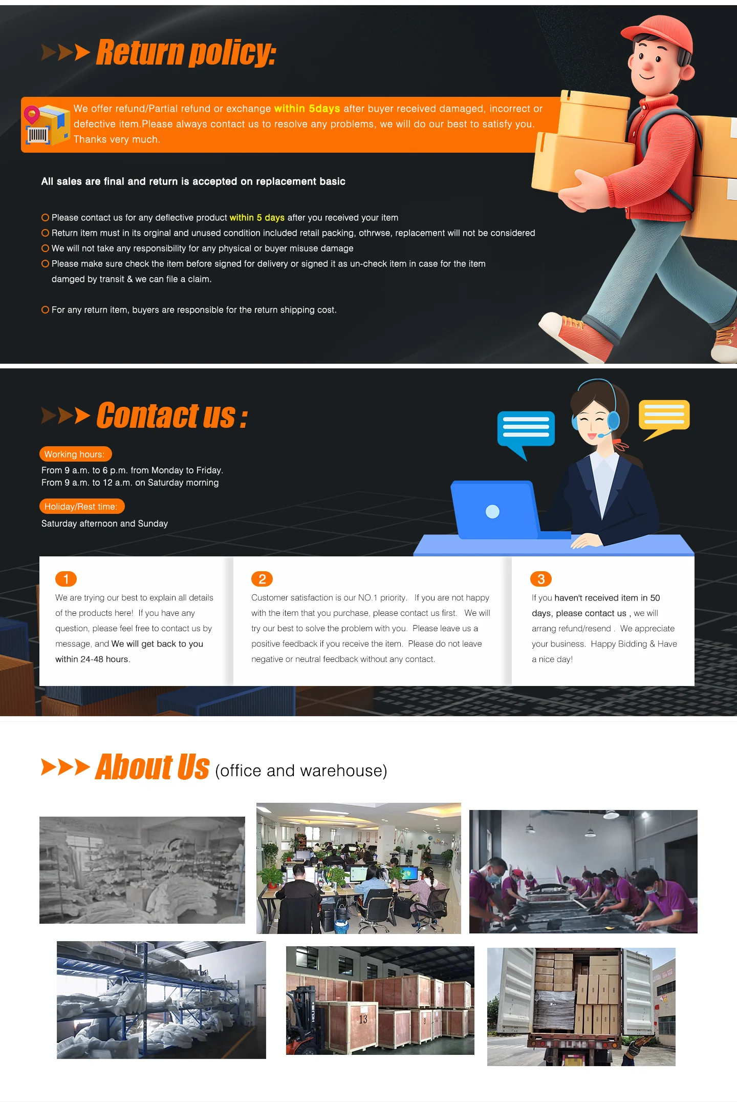| 1.We are trying our best to explain all details of the products here! If you have any question, please feel free to contact us by Ebay message, and We will get back to you within 24-48 hours. |