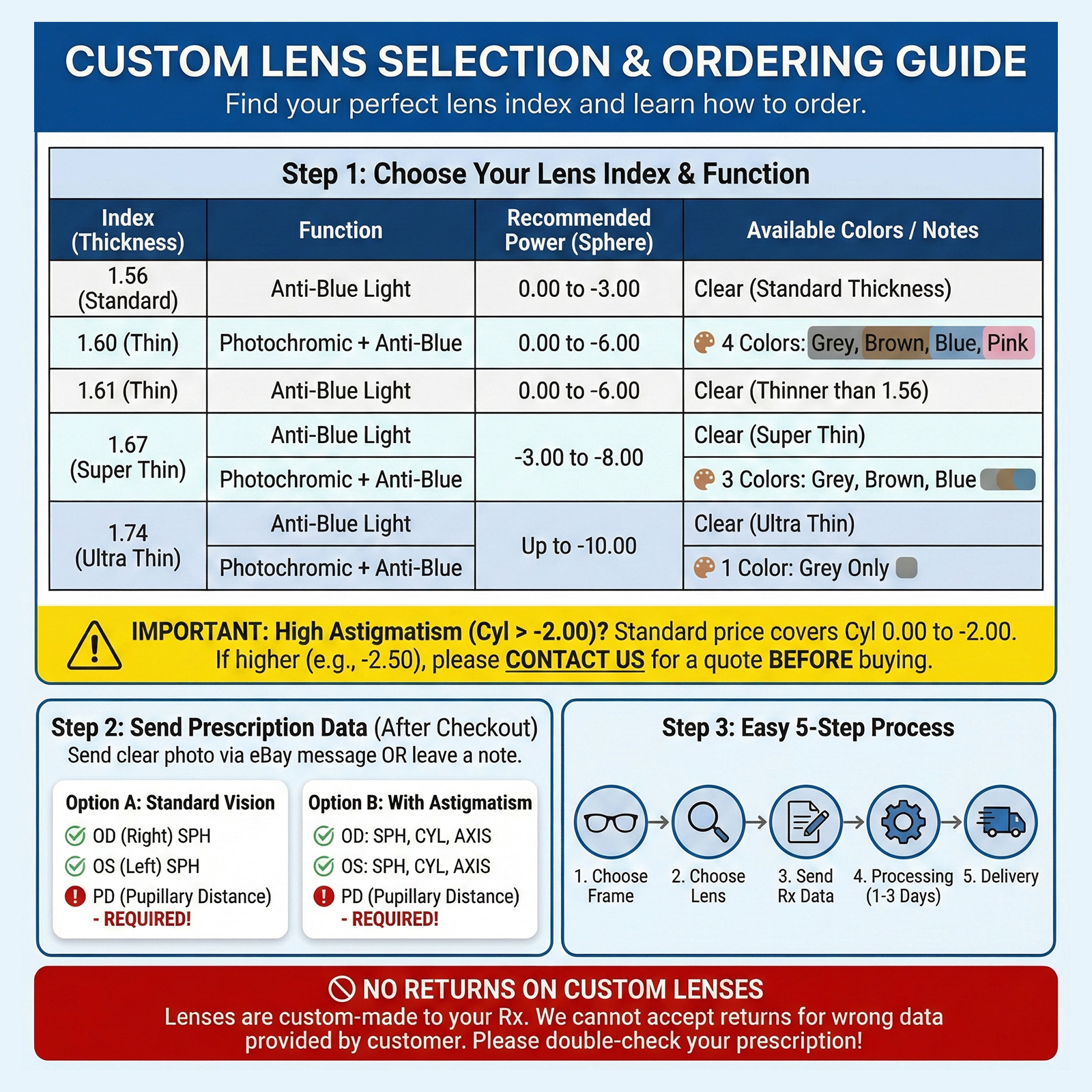 If your Cylinder is higher than -2.00 (e.g., -2.25, -3.00, etc.), please contact us via eBay Message for a custom quote before purchasing.