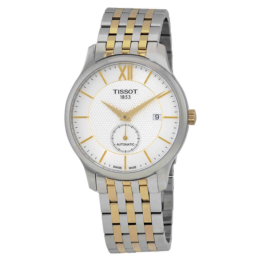 Silver dial enhanced by gold-tone dauphine-style shape hands. Silver-tone stainless steel case with a two-tone (silver-tone and gold pvd) stainless steel band. Automatic movement. 30 meters / 100 feet water resistance. Fixed bezel. Scratch Resistant Sapphire crystal. Transparent caseback. Butterfly clasp. Case size 40 mm x 11.2 mm. Band 20 mm x long. Tissot T063.428.22.038.00 Tradition Watch.