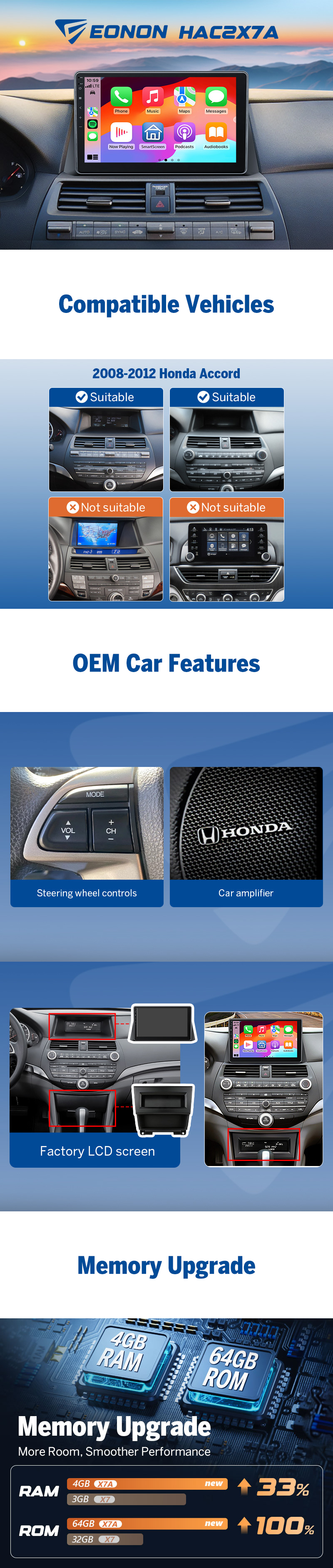 This Android Version head unit is a popular upgrade for Honda Accord owners seeking a modern Double DIN touchscreen system with stronger navigation, clearer audio, and seamless smartphone integration. Designed for shoppers searching for Wireless CarPlay, Android Auto, GPS Navi, and advanced DSP tuning, it offers smooth performance with improved RAM/ROM handling and a user-friendly interface. With WiFi 6, Bluetooth 5.4, and true Plug & Play fitment, it delivers reliable connectivity and Factory-style integration without wiring stress. Ideal for buyers looking for “2 DIN Android stereo,” “Accord-compatible Android radio,” “split-screen car display,” or “Android head unit compatible with Honda Accord 2008–2012.” Eonon HAC2X7A Android 14 4+64 10.1" for Honda Accord 2008-2012 Car Radio CarPlay