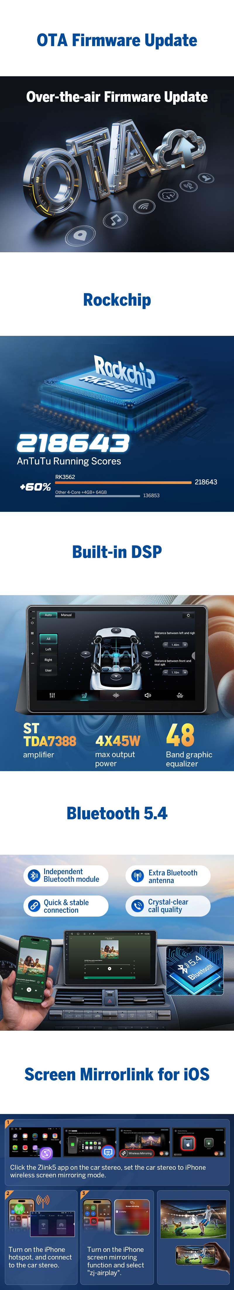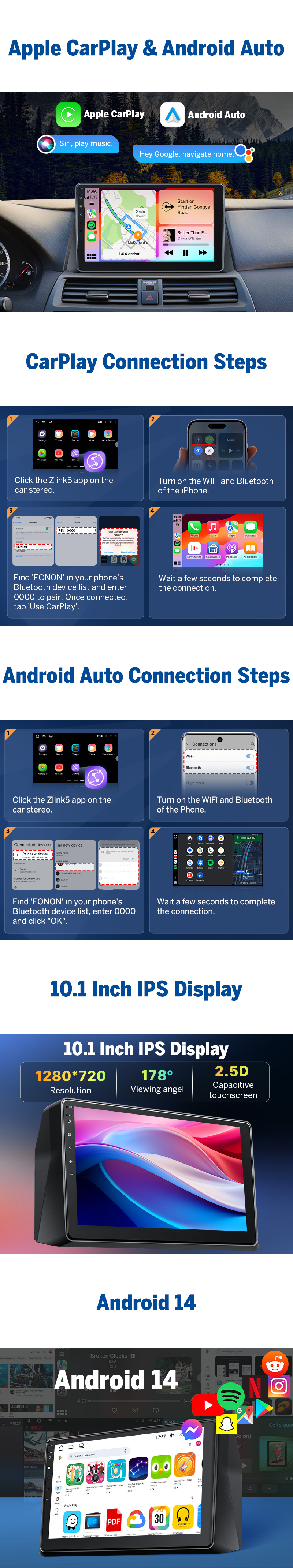 4GB RAM/64GB ROM | Wireless Apple CarPlay & Android Auto | 10.1" IPS HD Touchscreen | DSP Audio | Built-in GPS | WiFi 6 | Bluetooth 5.4