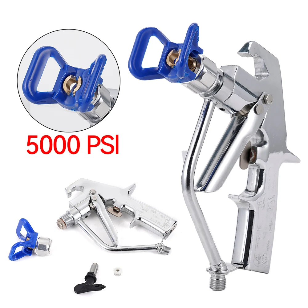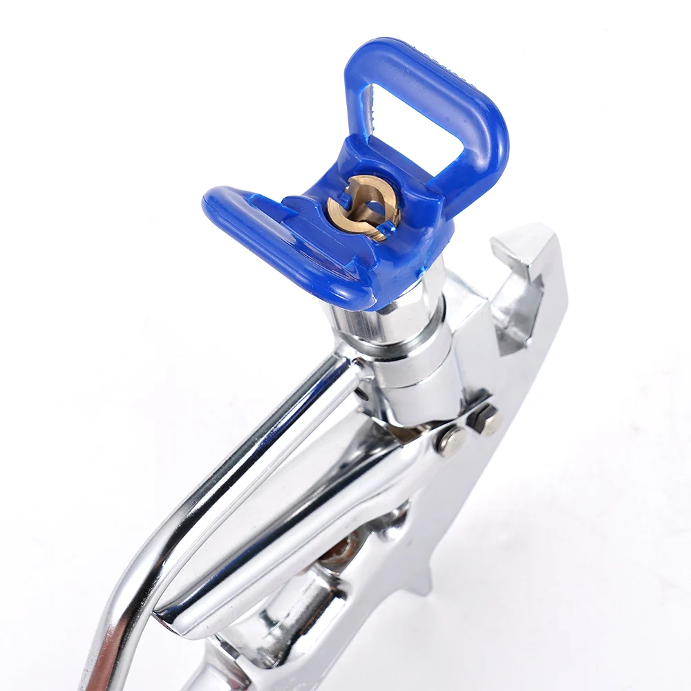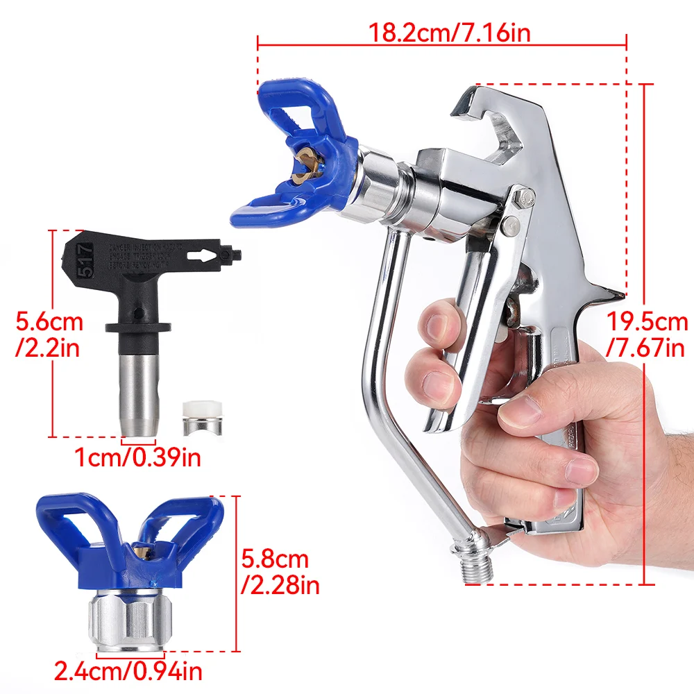 Airless Paint Spray Gun Sprayer Color:Blue Material: Metal Total length: 200 mm Total width: 180 mm Max WPR: 5000 PSI/345 bar Airless Spray Tip Color:Black Model:517 Maximum pressure 34.5 MPa 5000 PSl 345 Bar Size(L*H):4.3 x 4.5 cm Tungsten steel forging, is not easy to wear and durable. Steps to use: 1.First of all, the paint was removed to check whether there is a rupture damage, found that should be replaced immediately. 2.That will have the air pressure of the trachea access to the end of the handle end of the air inlet connection, you must check into the air outlet and each part of the connection whether have a leak, there is leakage phenomenon should be even maintenance. 3.According to the requirements of the quality of the paint required to adjust the application of the paint g u n How to maintain: 1.Every time the use of tools from the tool air inlet filling 3 to 4 drops of special gas oil to reduce wear and prolong the service life of the tool. 2.To ensure that the supply of gas source tool dry, no impurities 3.Regular cleaning, gas maintenance, timely replacement of worn parts Package Included: 1 x Paint Spray Gun(With Base)