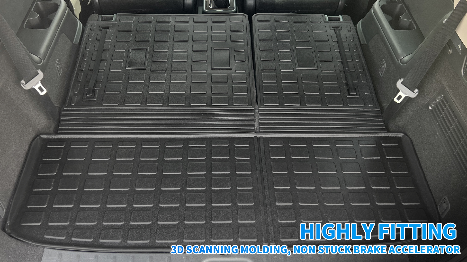 4.Simple Installation: Our mats are very easy to install. The back of our backrest mat has Velcro so that you can stick and fix easily.You do not need additional tools to assist in installation,just put the trunk mats and floor mats in the right place.Note that if your car is an 8-seat model, the floor mats are perfectly suitable. If your car is a 7-seat model,the 3rd floor mats need to be cut by yourself.You can see a clear cut line mark on the 3rd floor mats, just cut along the line.