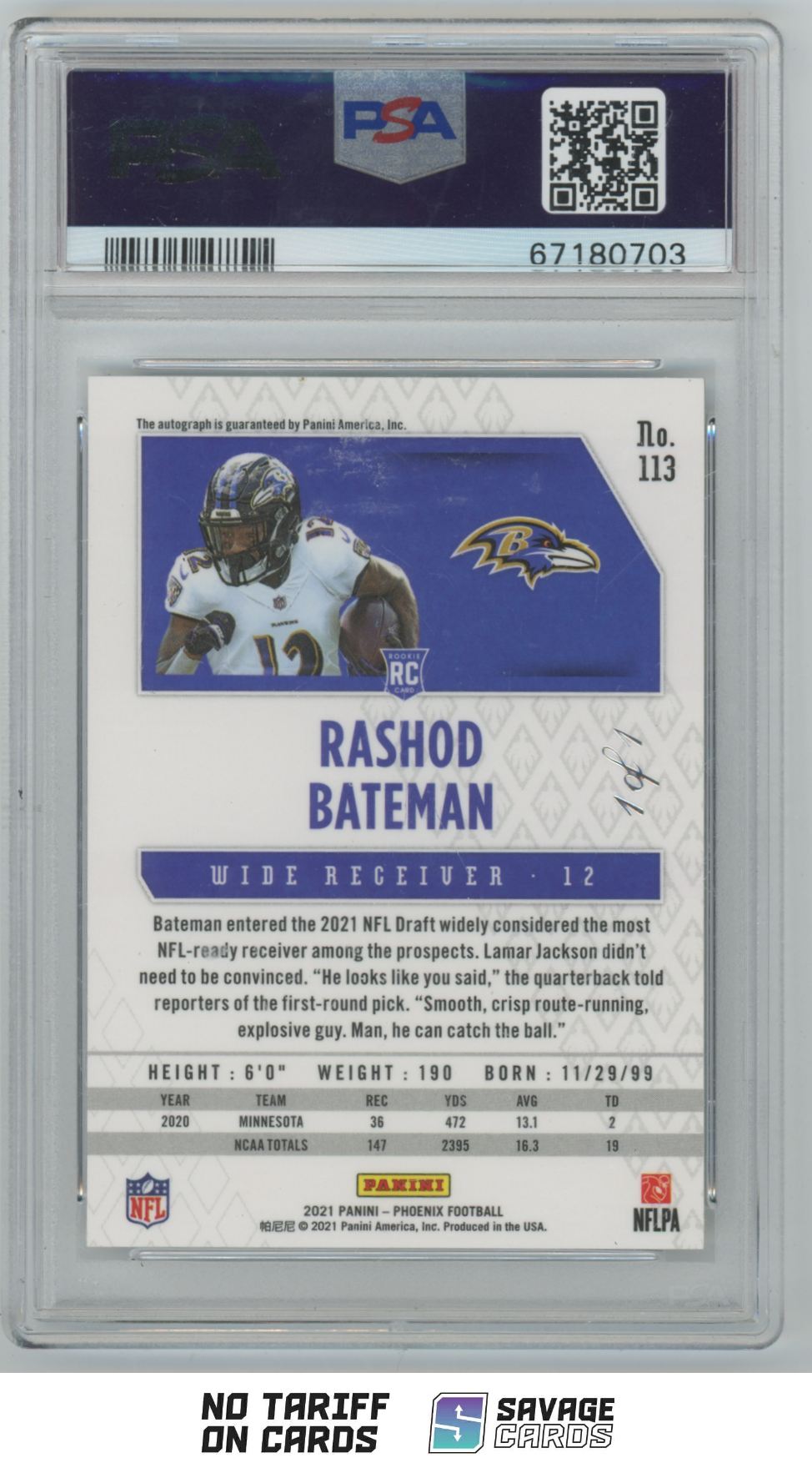 | 2021 Panini Phoenix Auto White Summer Rashod Bateman RC PSA 10 1/1 #113 | ||||||||||||||||||||||