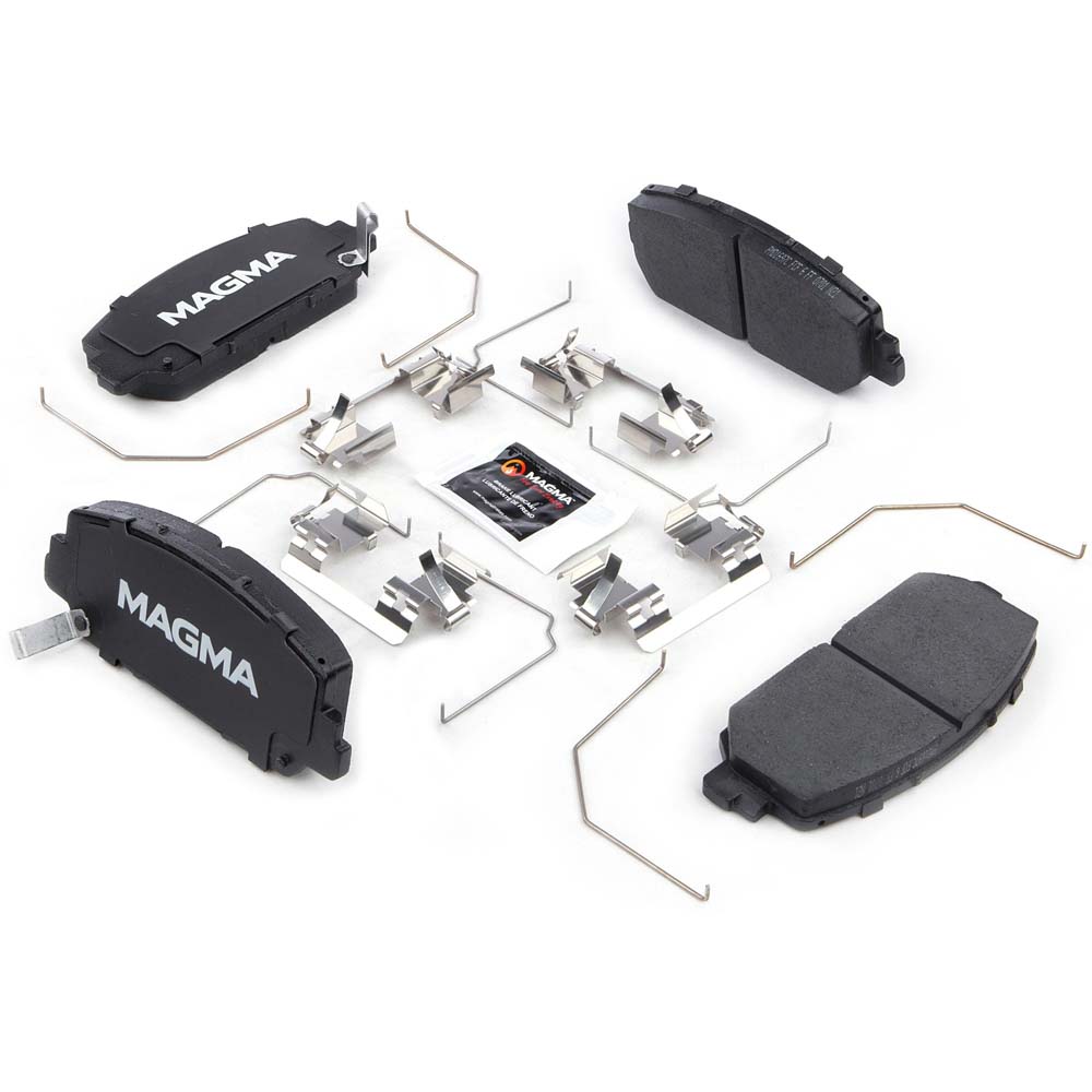 WHY MAGMA? - Today's harsh braking environments can create very high heat levels in your braking system which can reduce the vehicle's ability to stop. Extreme high temperatures can be reached in many braking situations such as - Stop and Go Traffic, Mountain Driving, Hauling or Towing, Emergency Stops, Spirited Driving and Long, Sustained Braking. At MAGMA Brakes, we use FIRE to fight FIRE. Our brake system components are made using advanced, state of the art techniques and treatments that ensure our brakes will stand up to the heat.MAGMA Premium brake pads feature...1. Scorched, copper-free friction formulations for optimal stopping power2. Heat-treated rubberized multi-layer shims for superior noise dampening3. Heat-tempered stainless steel hardware kits to restore the brake pad to caliper interface (where applicable)4. High-heat resistant brake lubricant included for lubricating critical points during pad installation