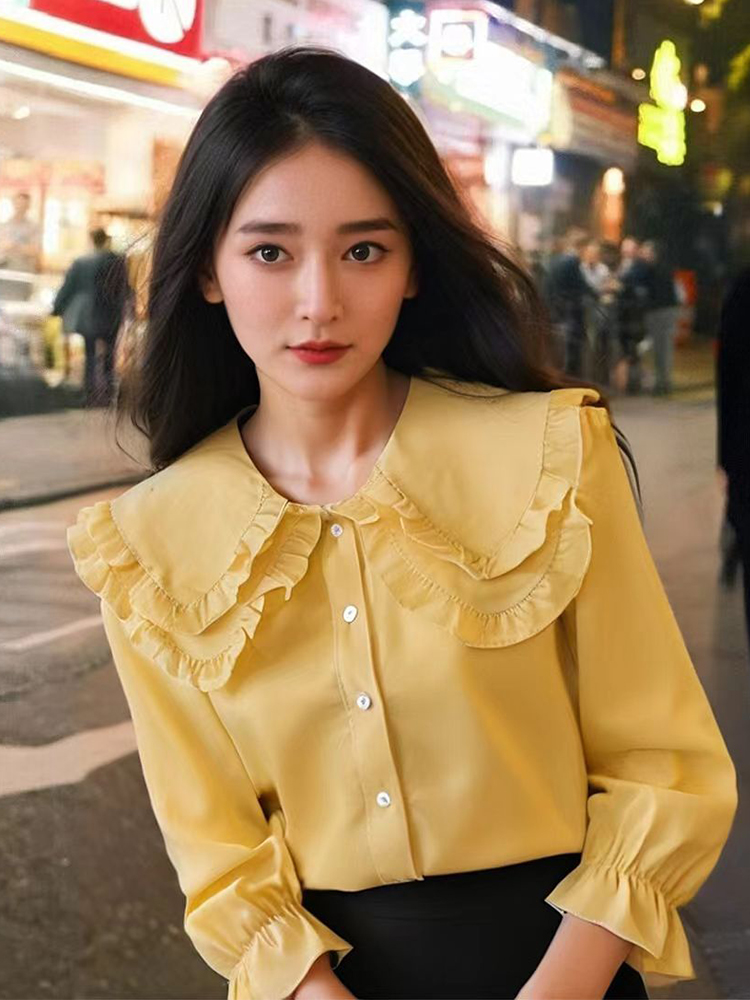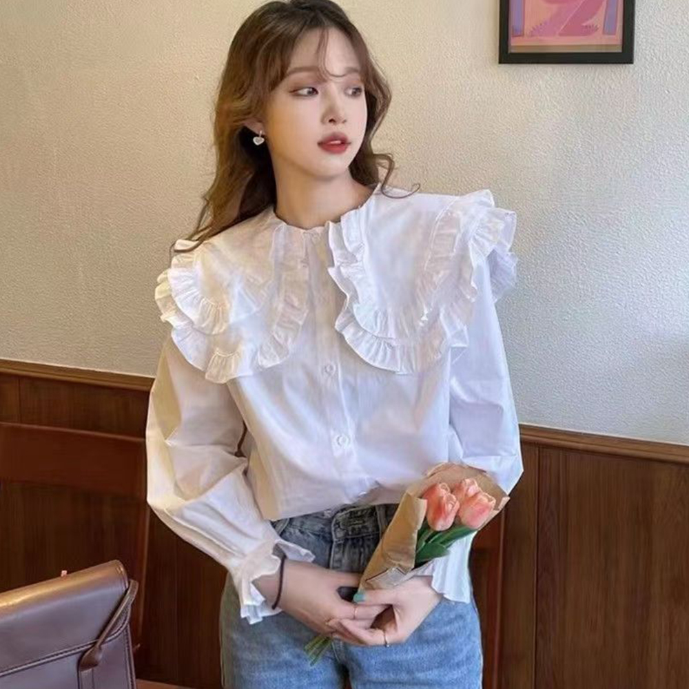 Women Sweet Kawaii Lolita Peter Pan Collar Blouse Ruffled Top Student Daily Wear